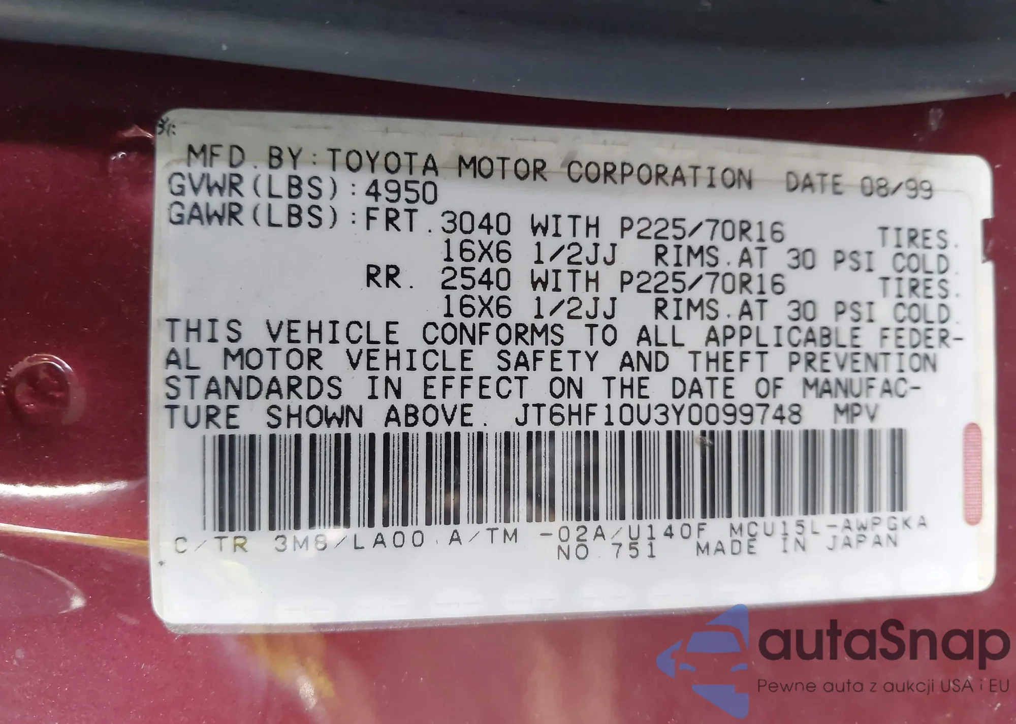 LOT: 43370852 VIN: JT6HF10U3Y0099748