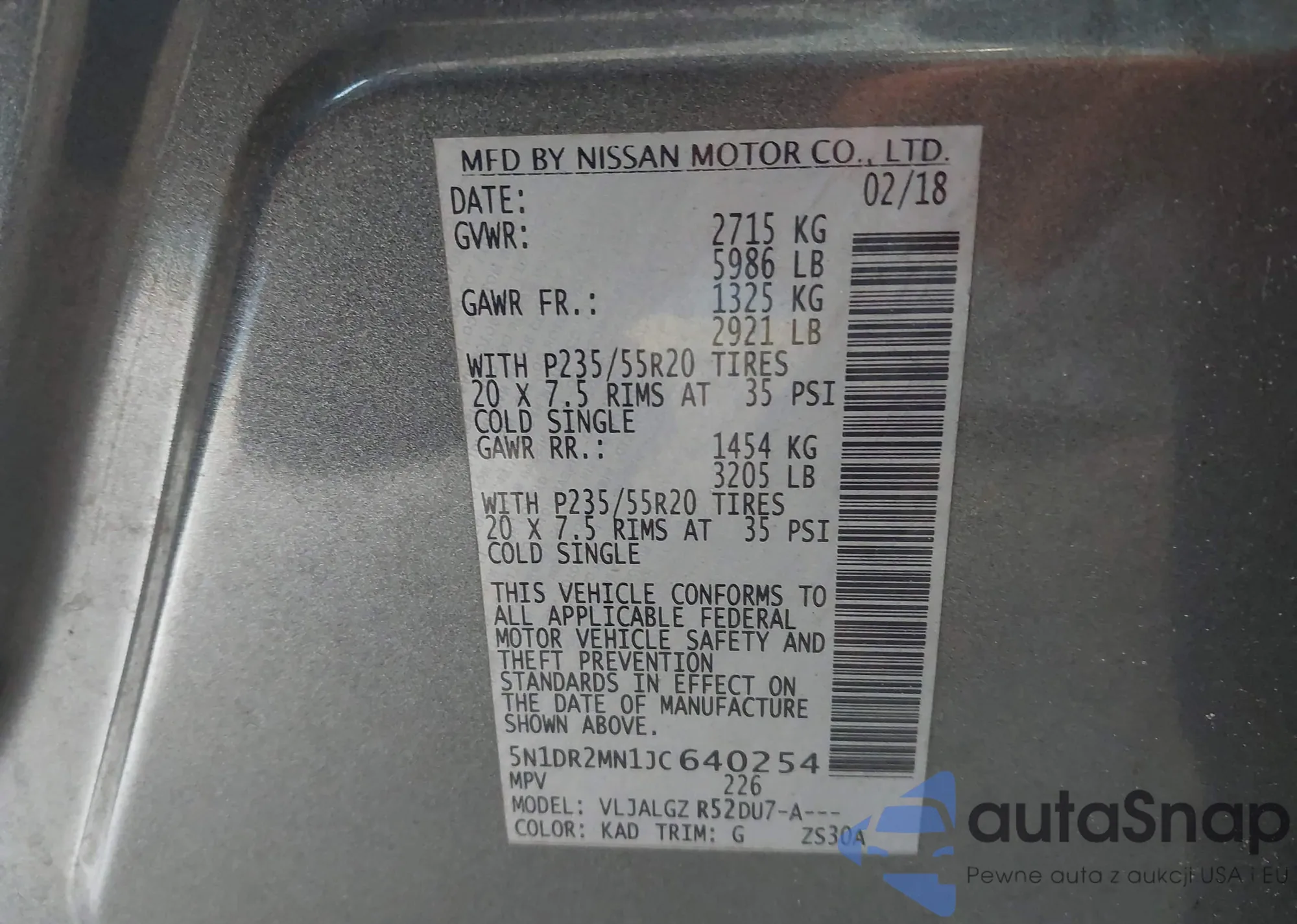 LOT: 43556252 VIN: 5N1DR2MN1JC640254