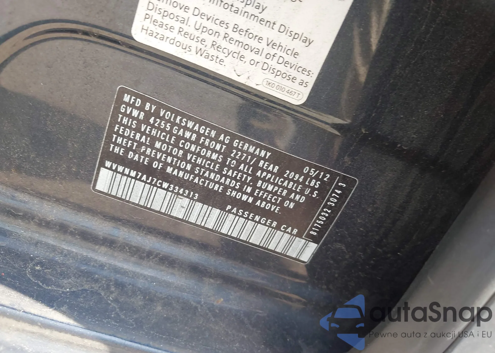 LOT: 42685451 VIN: WVWNM7AJ7CW334313