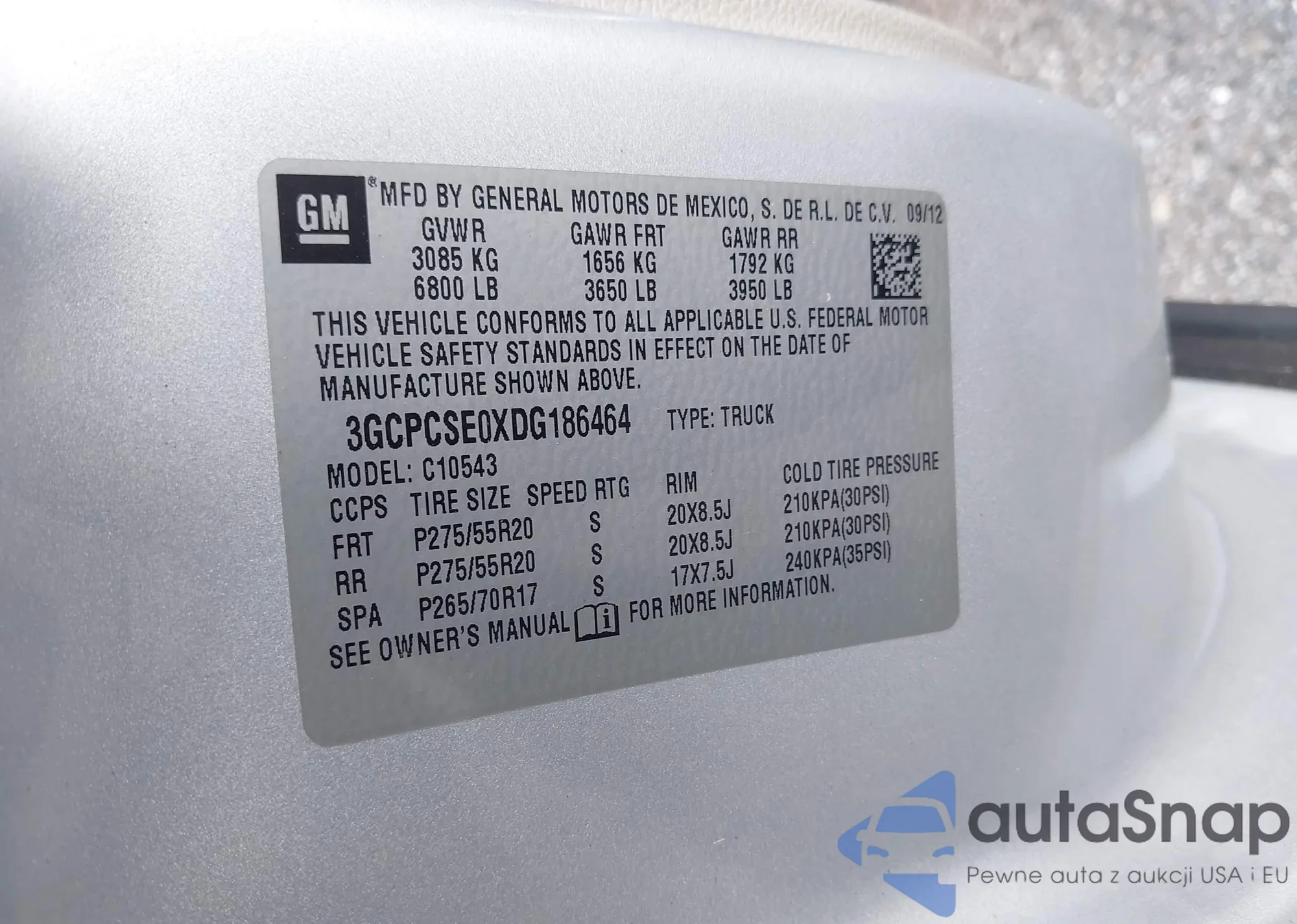 • VIN 3GCPCSE0XDG186464
