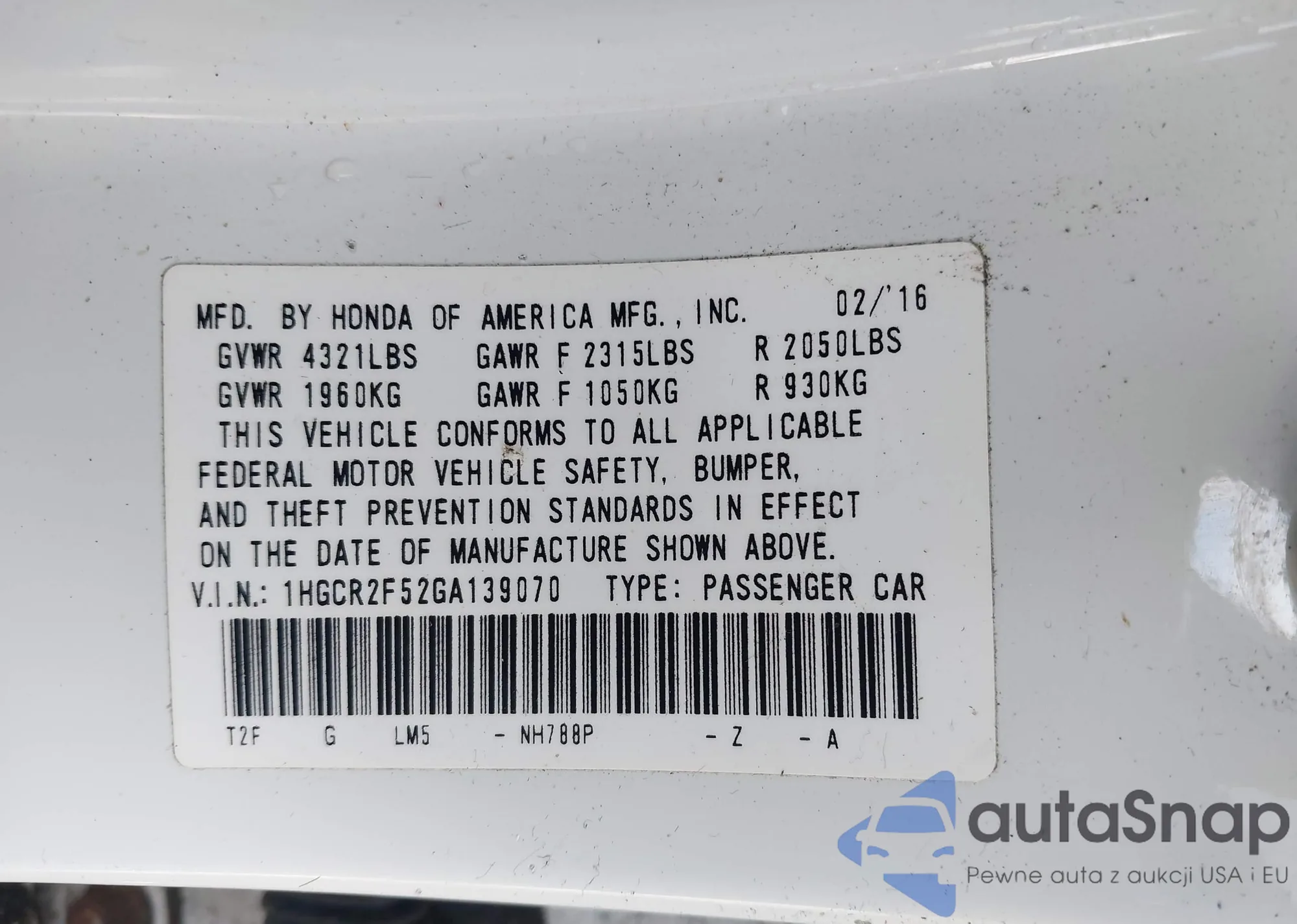 LOT: 43321451 VIN: 1HGCR2F52GA139070