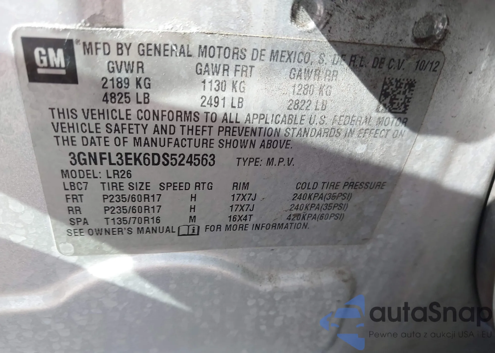 LOT: 43326185 VIN: 3GNFL3EK6DS524563