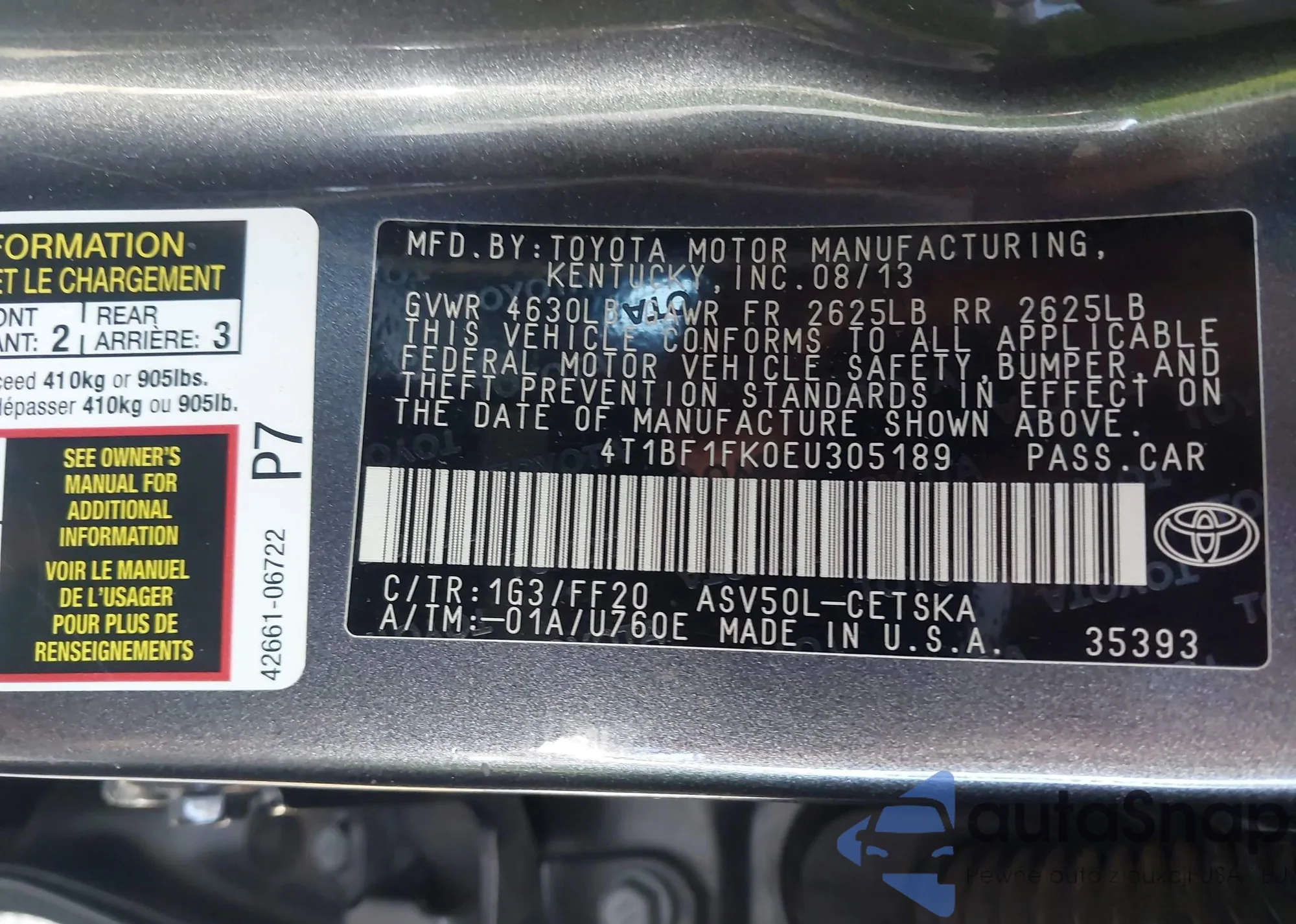 • VIN 4T1BF1FK0EU305189