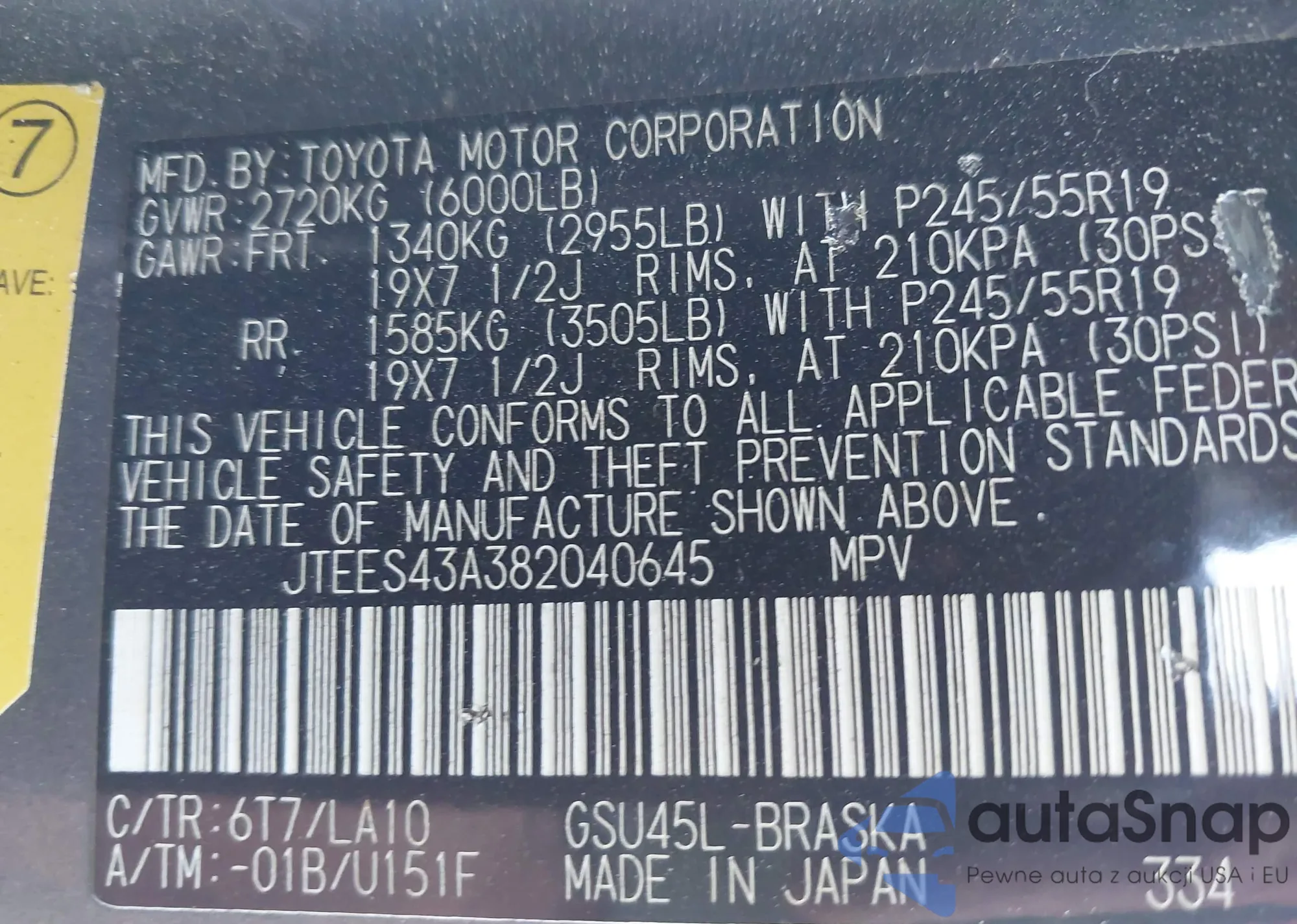 LOT: 43273724 VIN: JTEES43A382040645