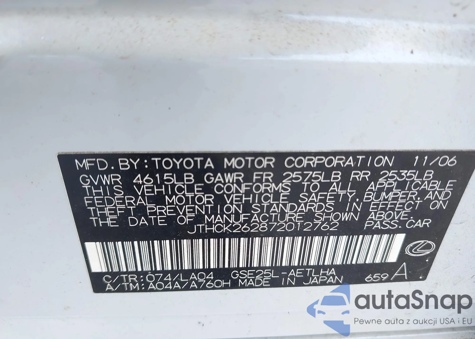 LOT: 43364232 VIN: JTEZU5JR4A5007166