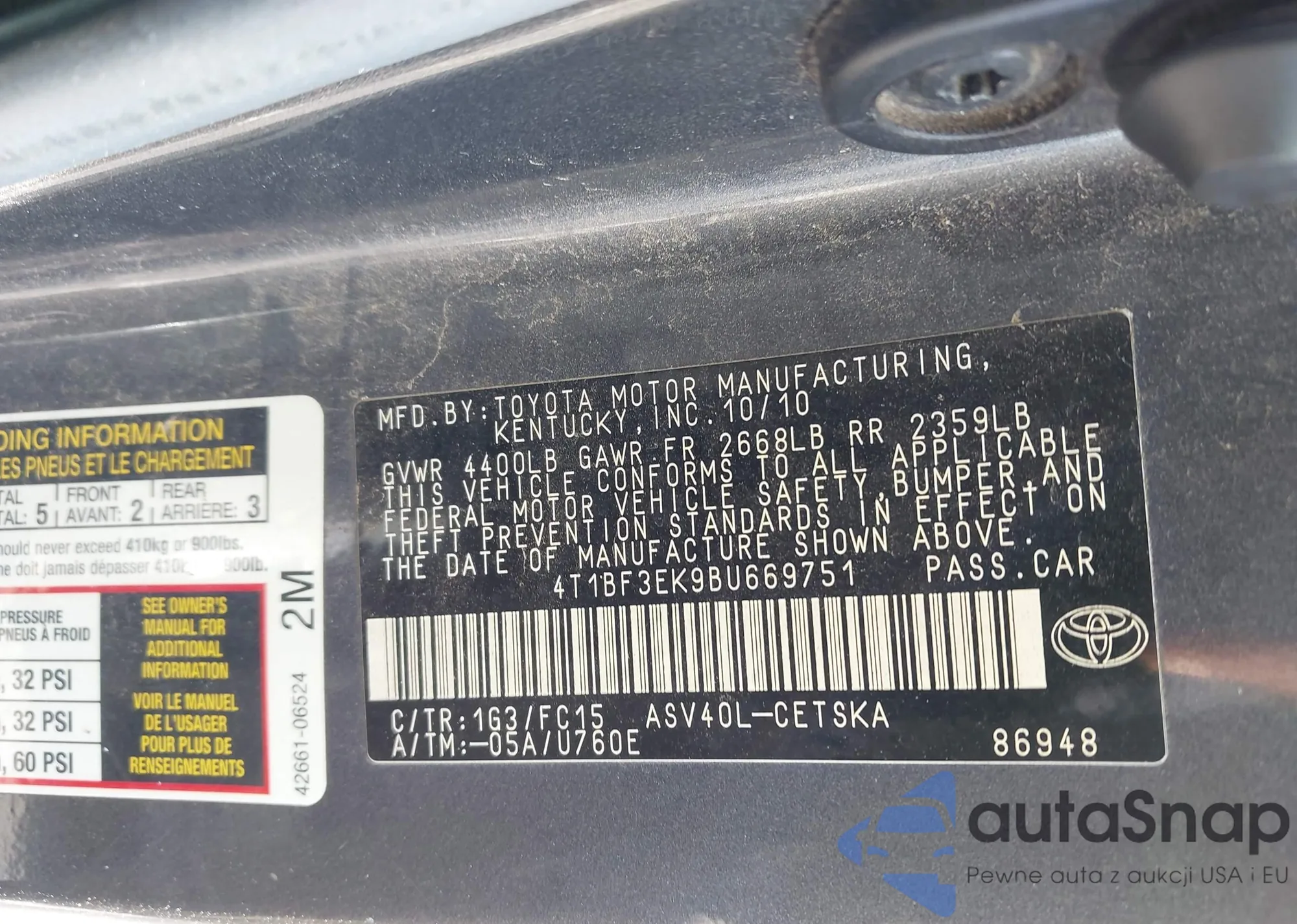 LOT: 43361444 VIN: 4T1BF3EK9BU669751
