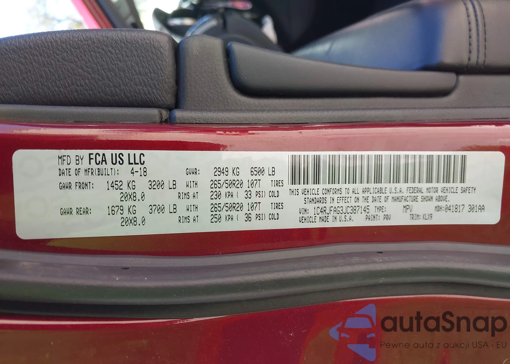 • VIN 1C4RJFAG3JC387145