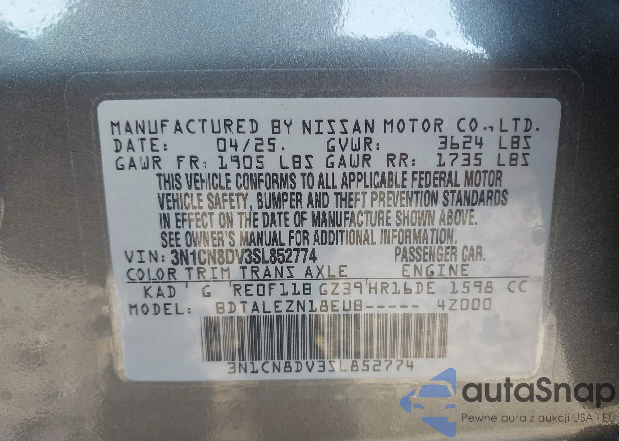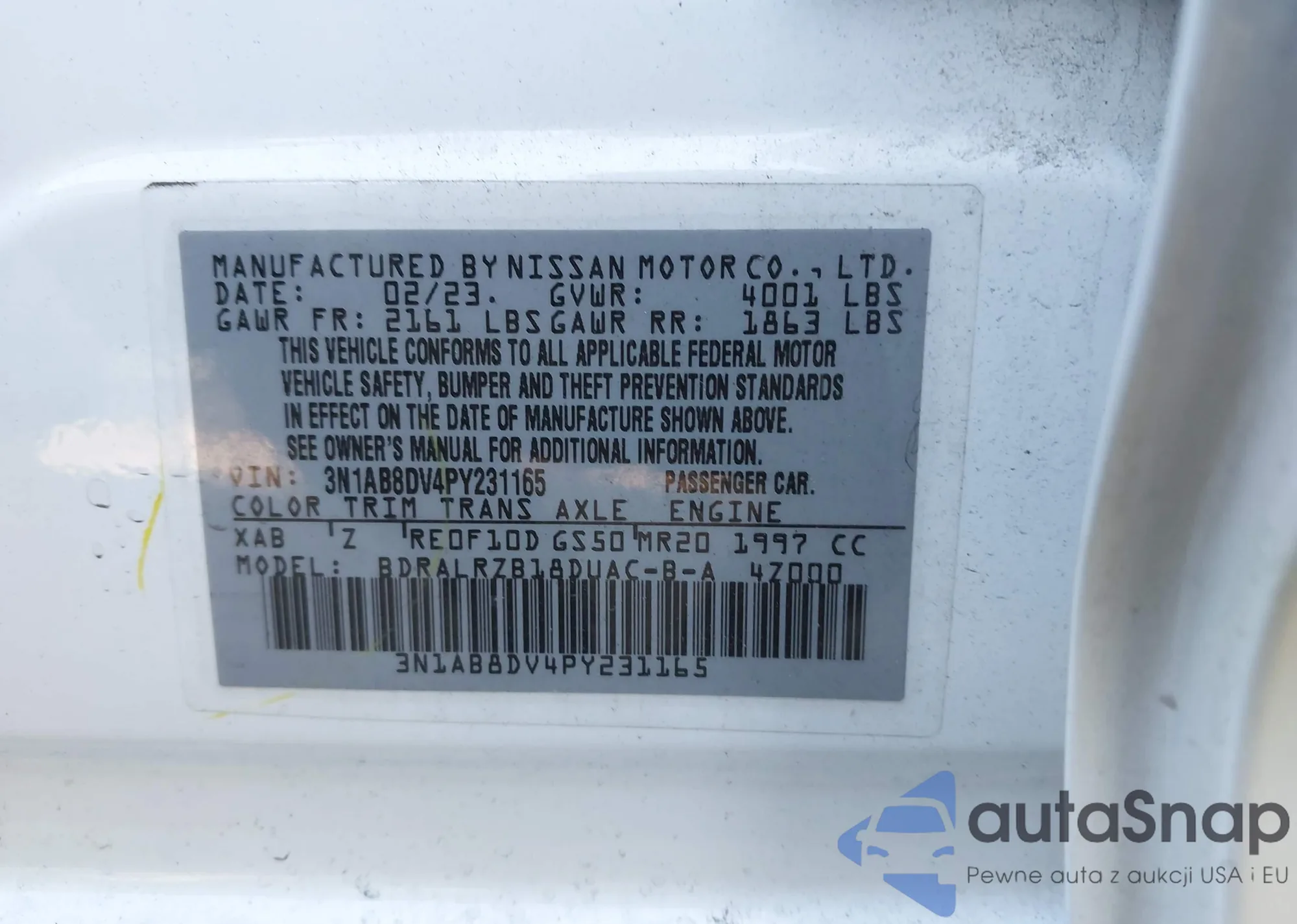 • VIN 3N1AB8DV4PY231165