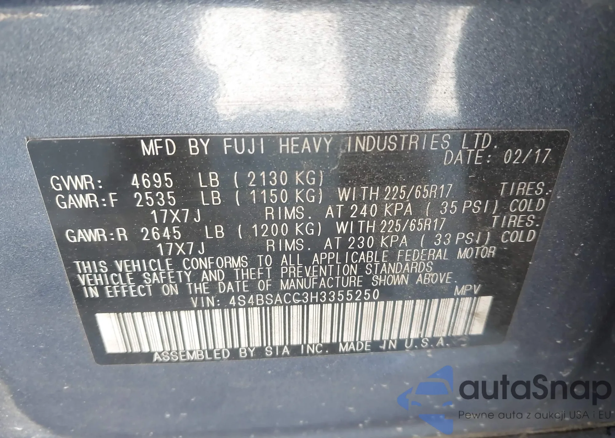 • VIN 4S4BSACC3H3355250