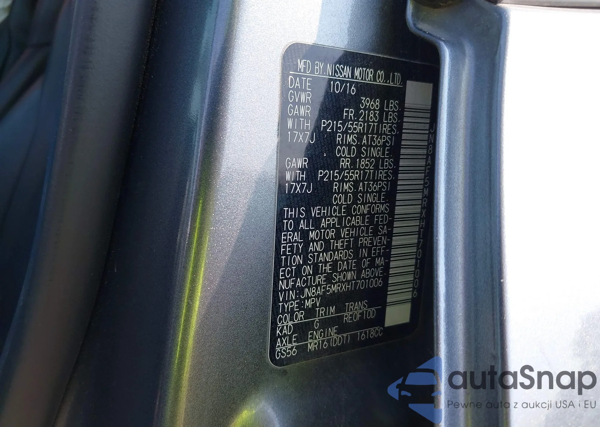 LOT: 43169609 VIN: JN8AF5MRXHT701006