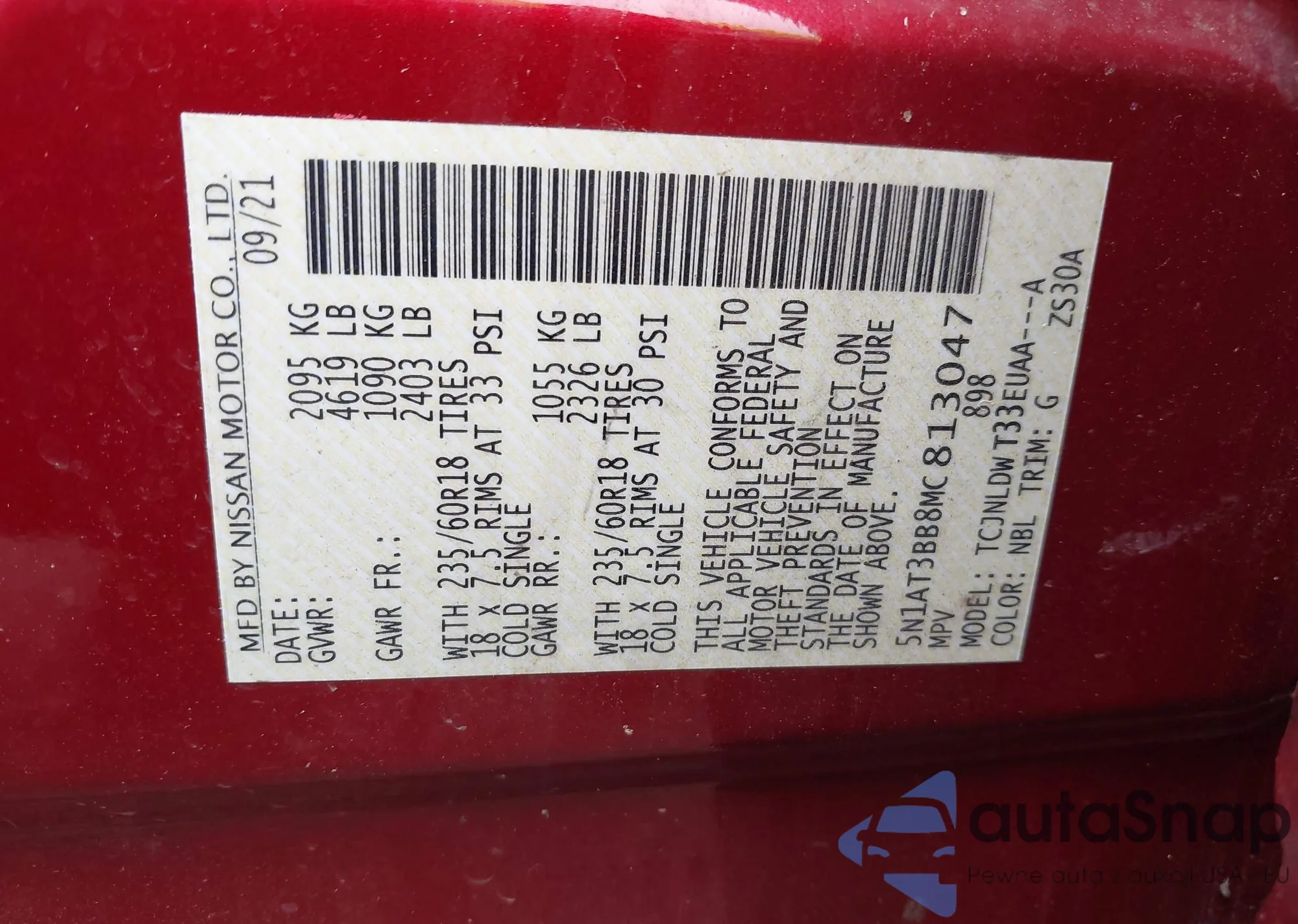 LOT: 43175655 VIN: 5N1AT3BB8MC813047