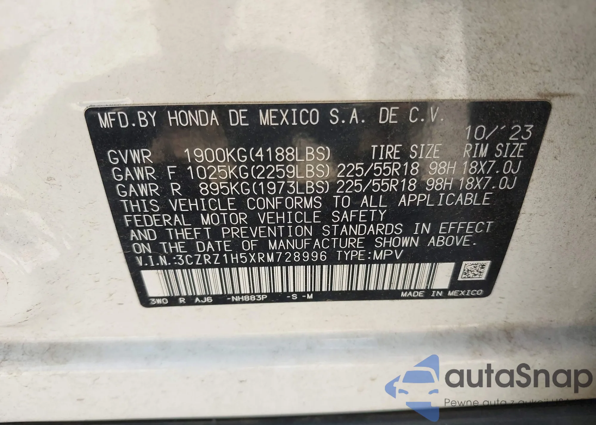• VIN 3CZRZ1H5XRM728996