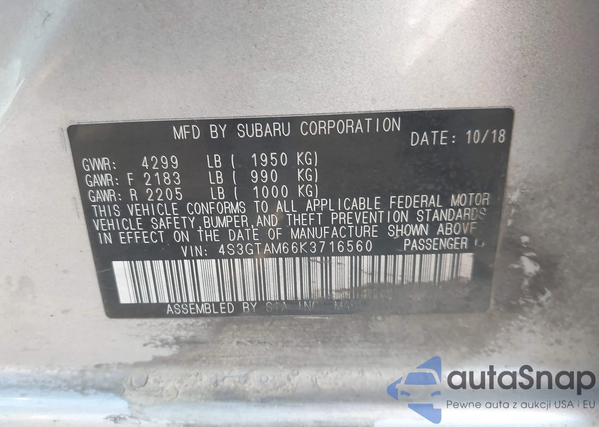 LOT: 43439089 VIN: 4S3GKAB65K3620845
