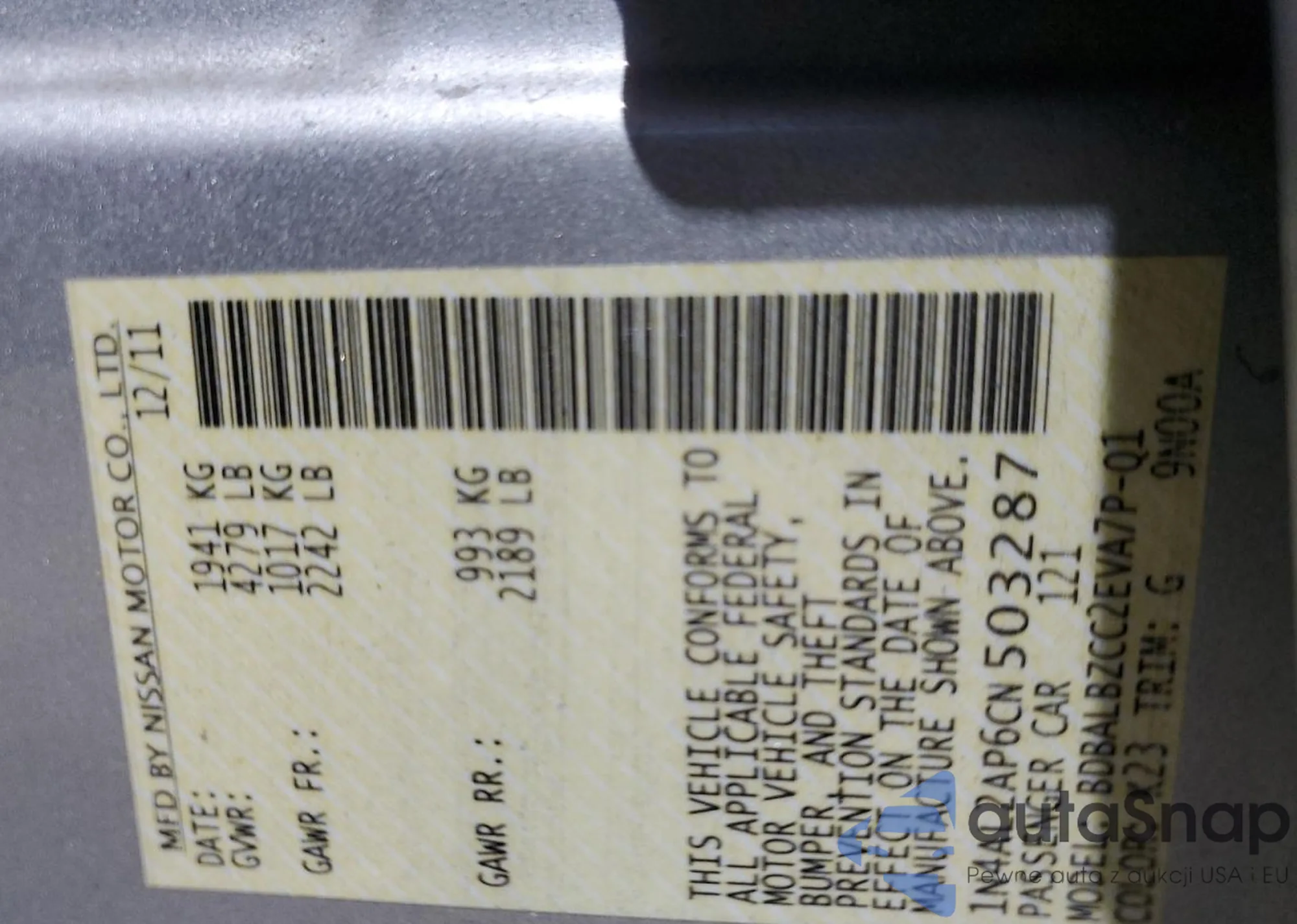 LOT: 70485015 VIN: 1N4AL2AP6CN503287
