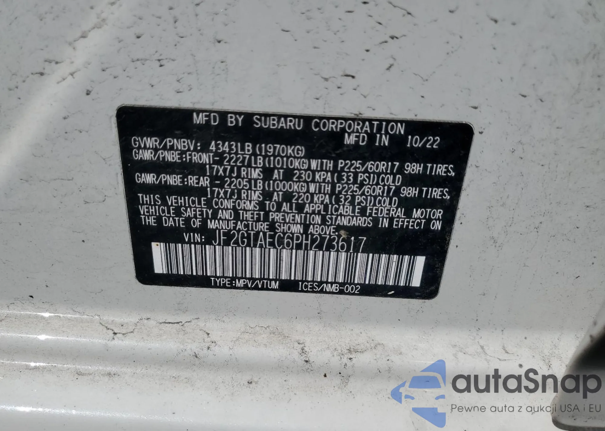 • VIN JF2GTAEC6PH273617