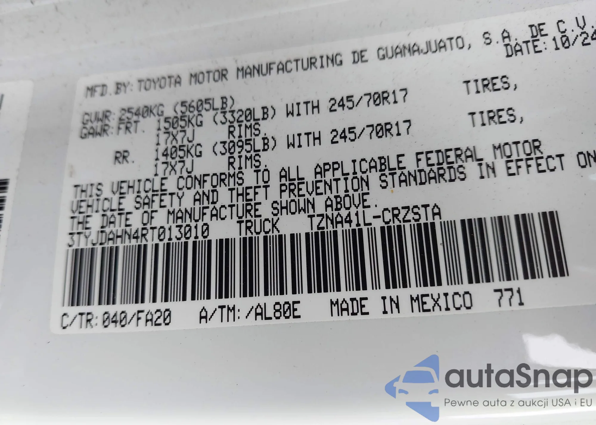 • VIN JTEAAAAH8MJ010928