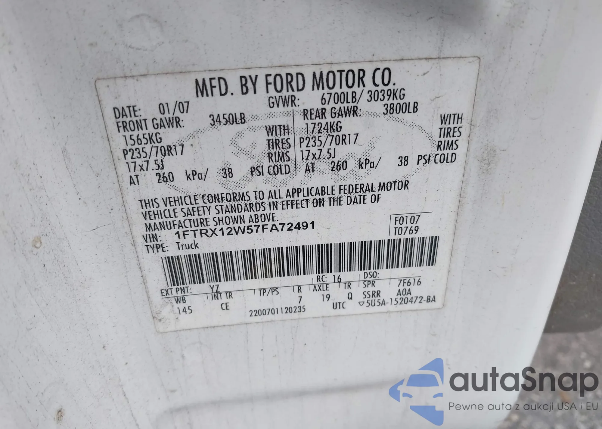 LOT: 43430894 VIN: 1FTRX12W57FA72491