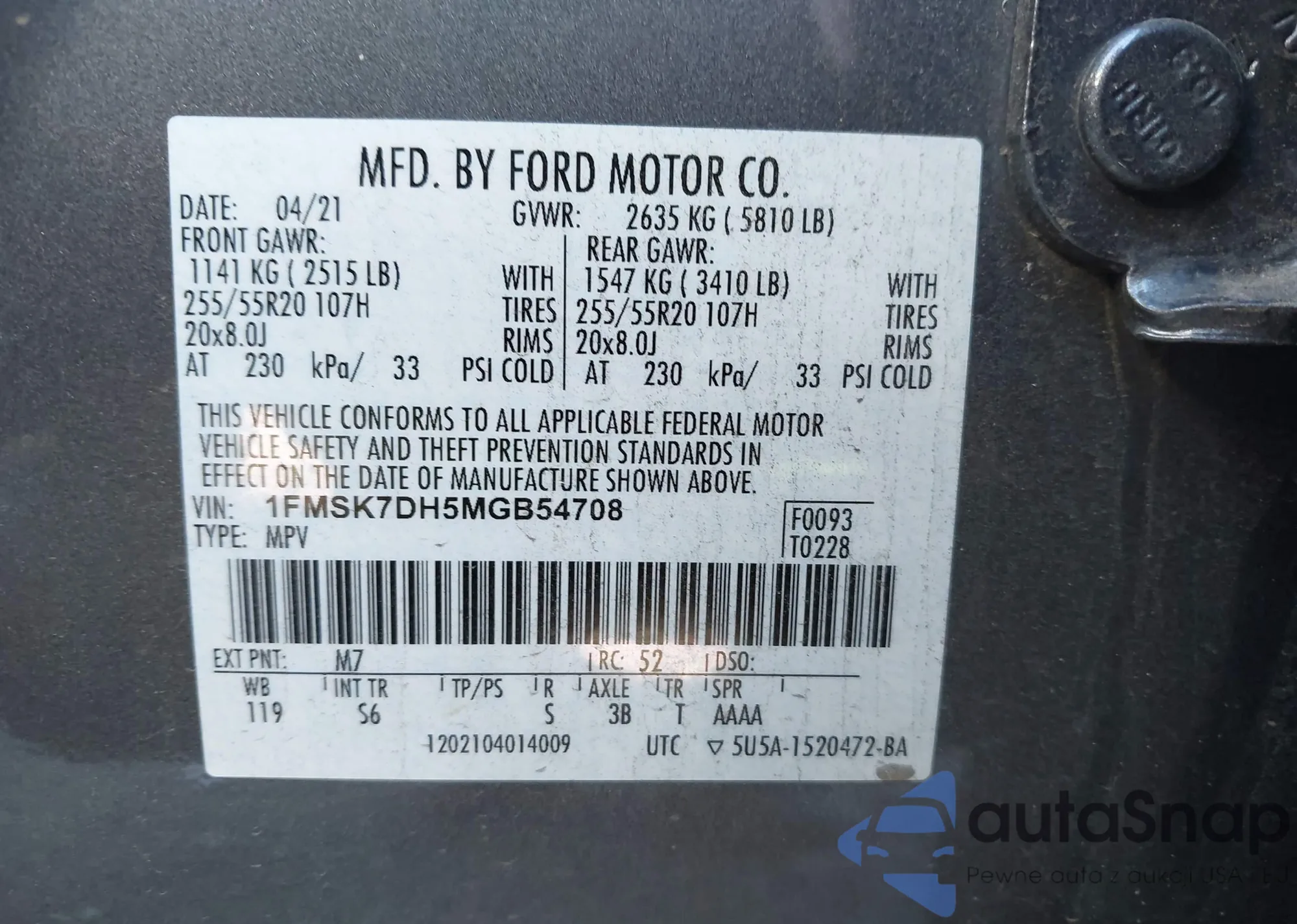 • VIN 1FMSK7DH5MGB54708