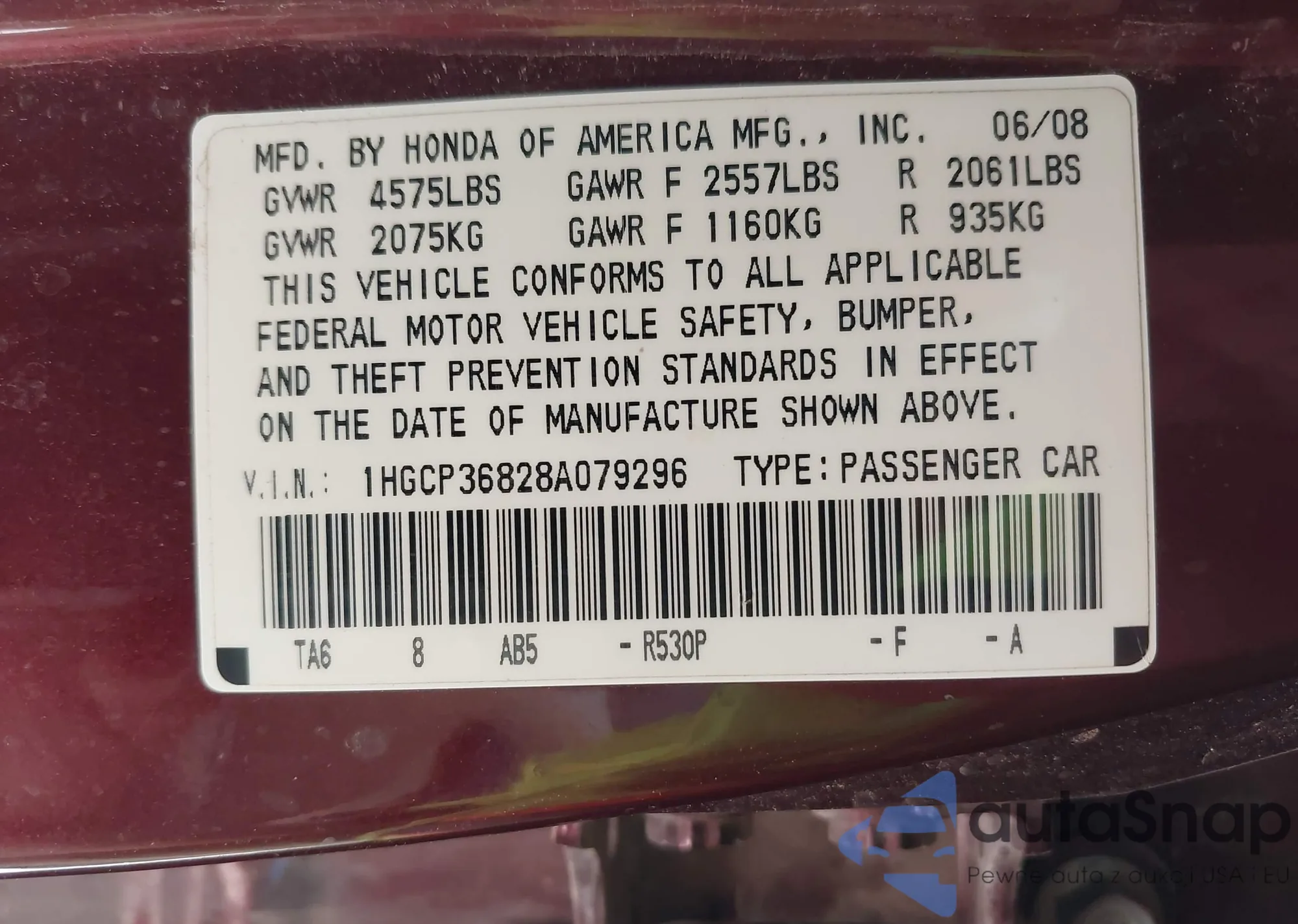LOT: 43325254 VIN: 1HGCP36828A079296