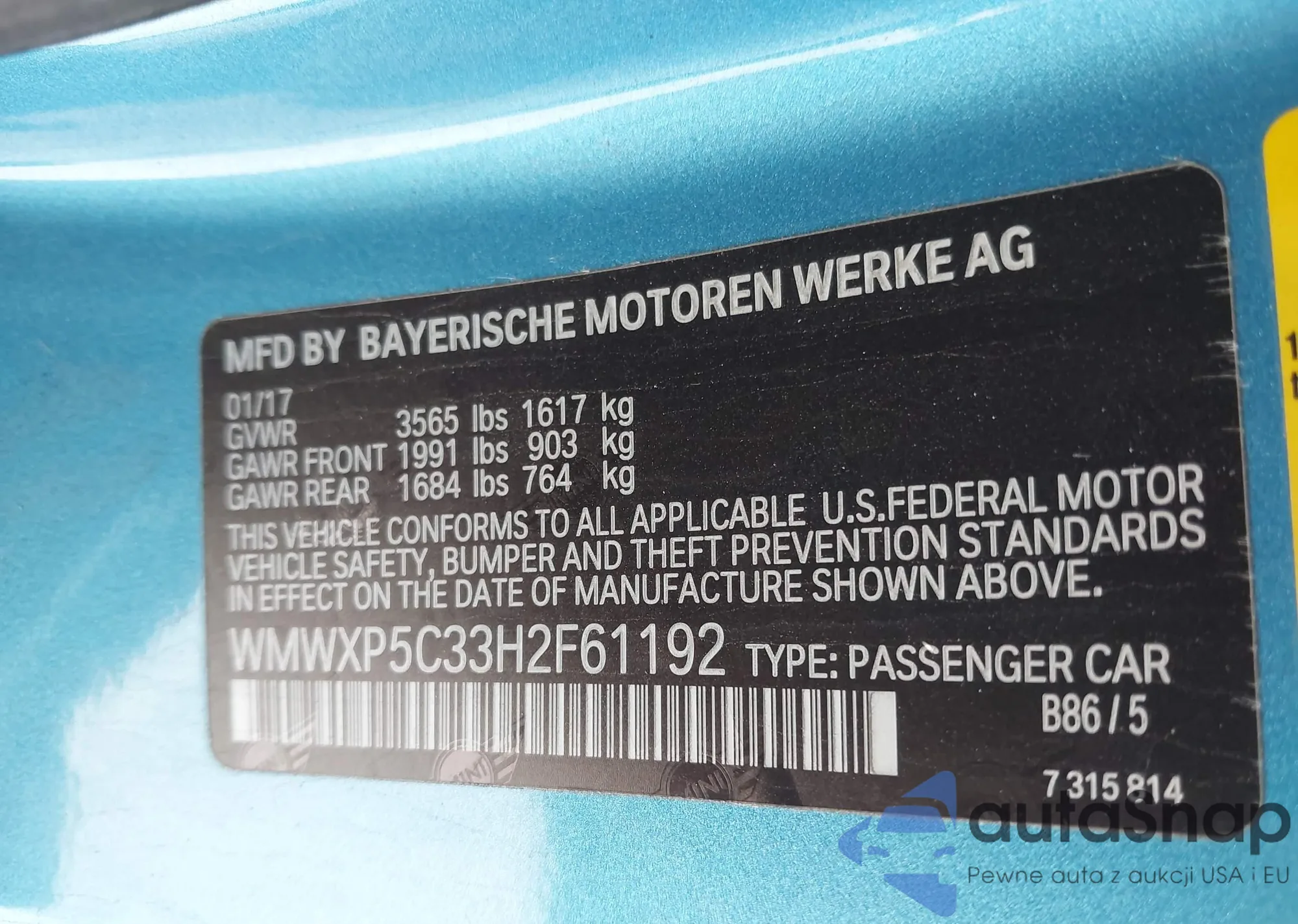 LOT: 43205807 VIN: WMWXP5C33H2F61192