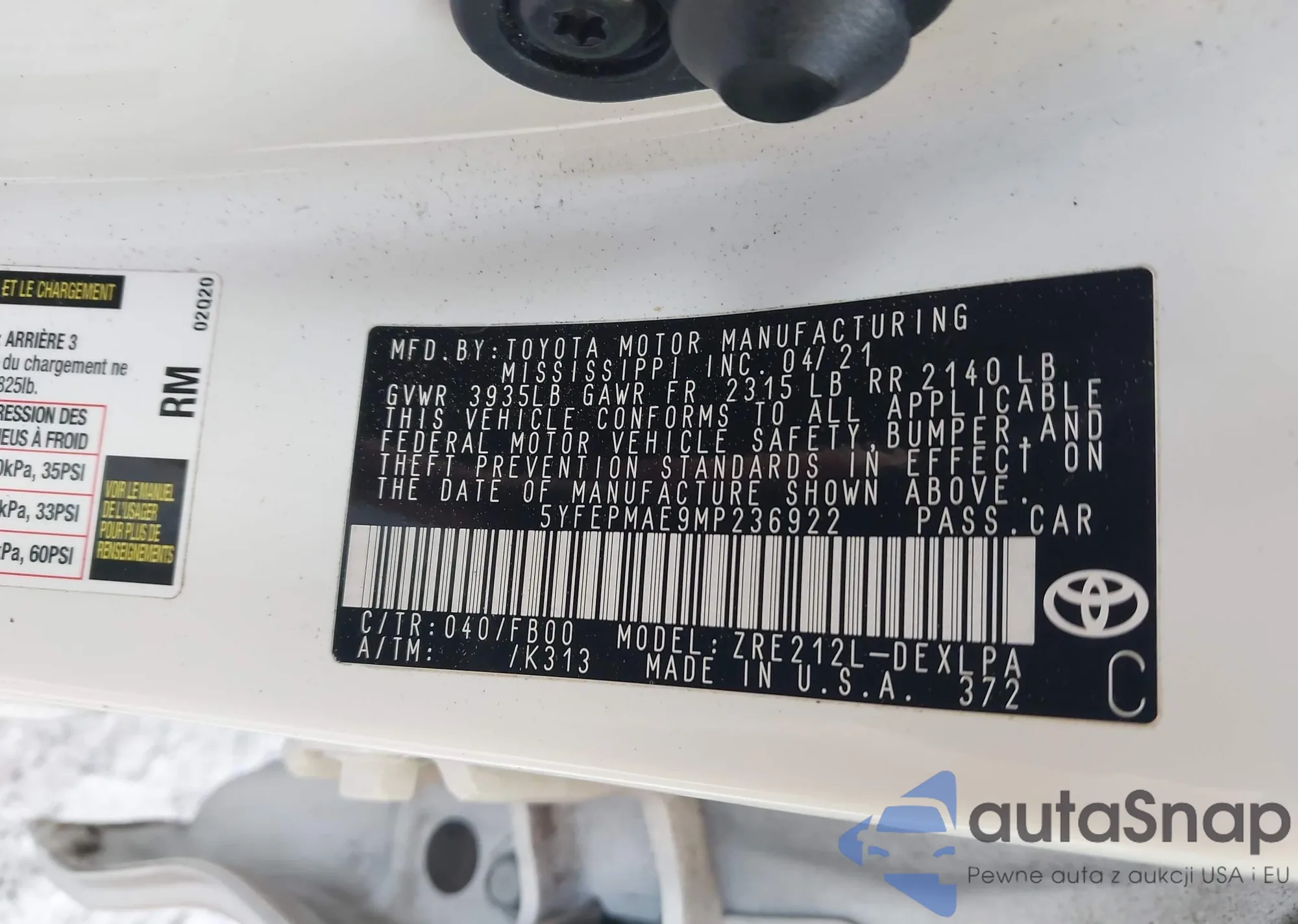 LOT: 43279551 VIN: 5YFEPMAE9MP236922