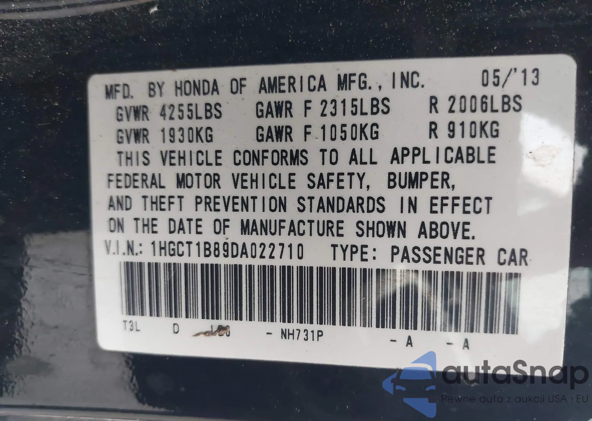 LOT: 43294730 VIN: 1HGCT1B89DA022710