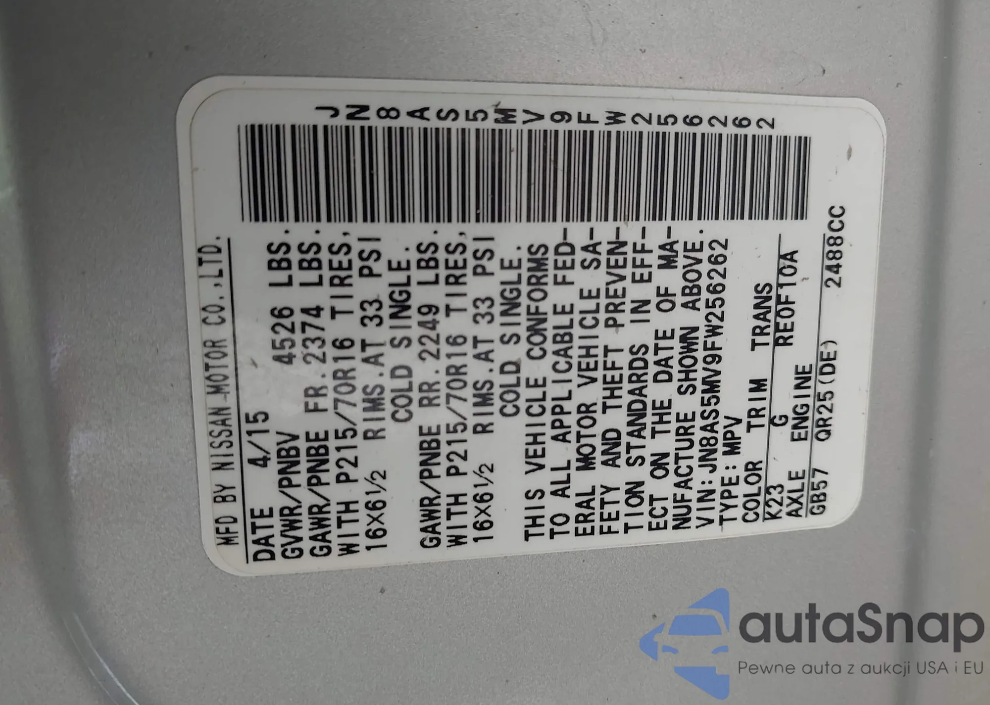 LOT: 43430741 VIN: JN8AS5MV9FW256262