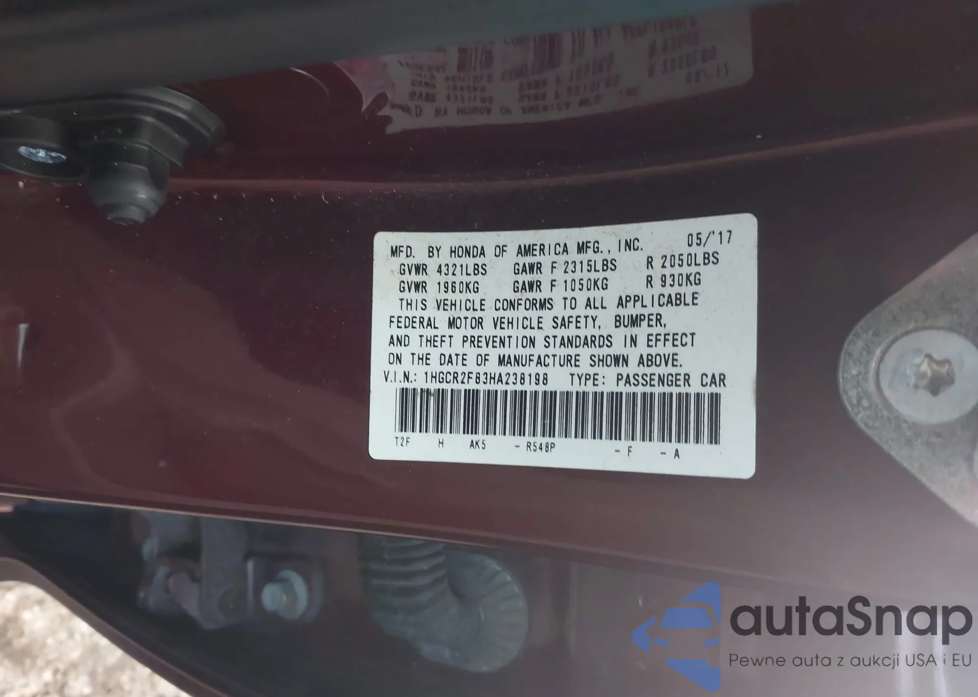 LOT: 43583077 VIN: 1HGCR2F83HA238198