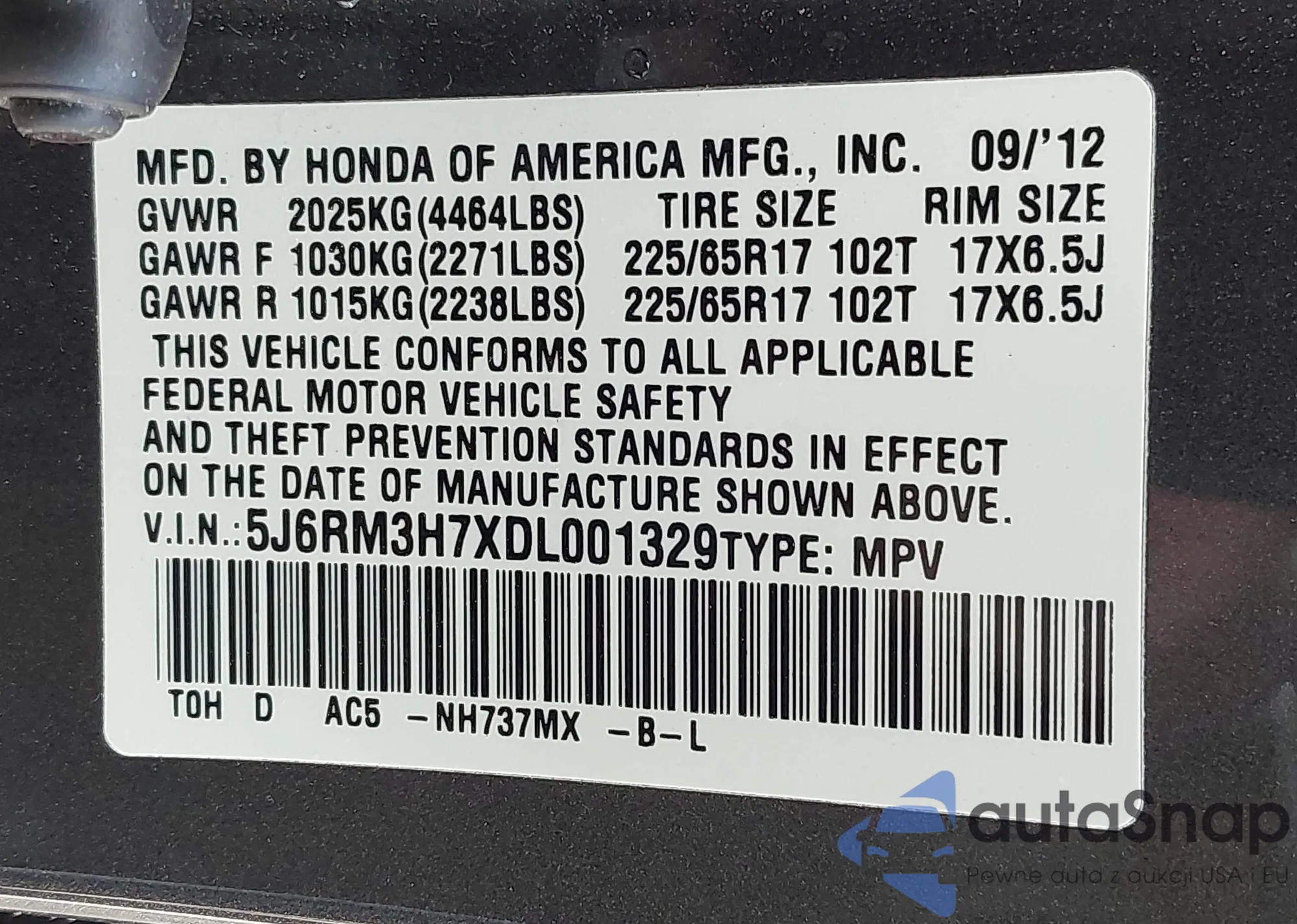 • VIN 5J6RM3H7XDL001329