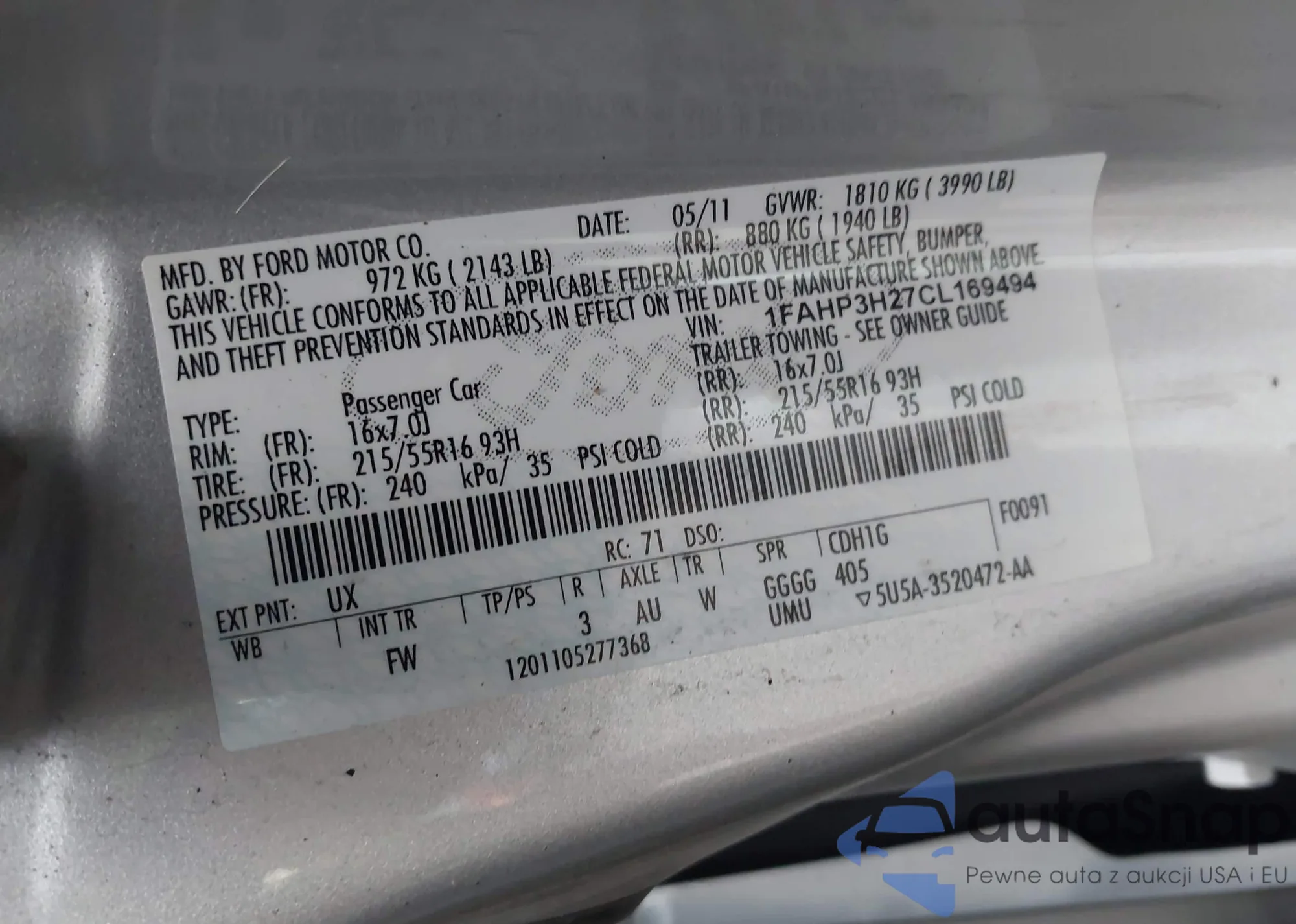 LOT: 42760785 VIN: 1FAHP3H27CL169494