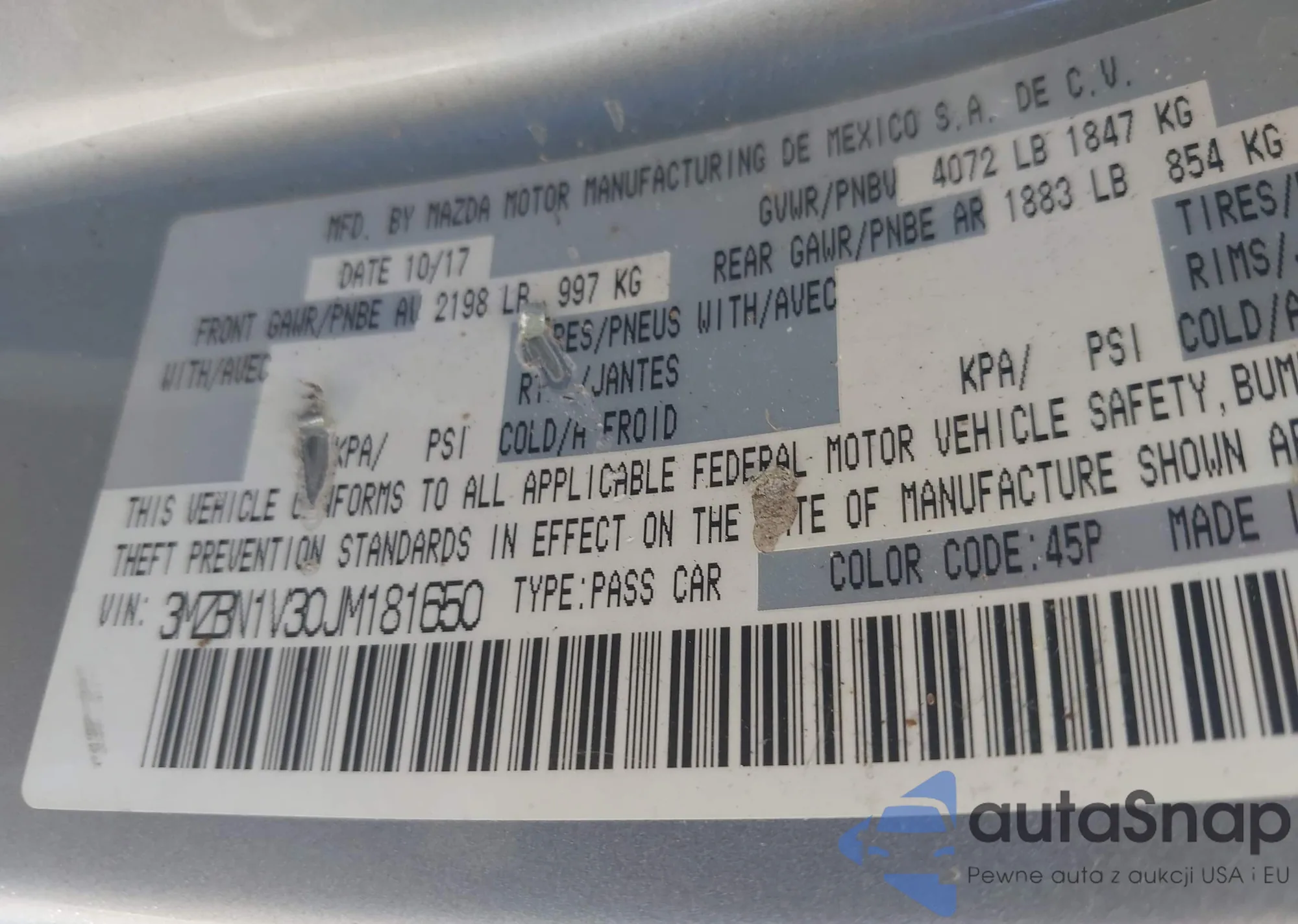 LOT: 43550502 VIN: 3MZBN1V30JM181650