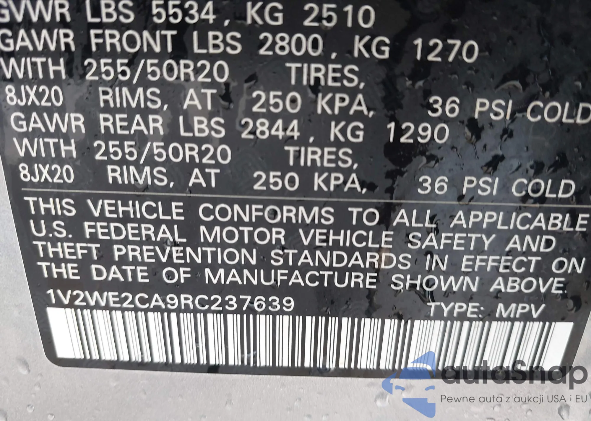LOT: 43240576 VIN: 1V2WE2CA9RC237639
