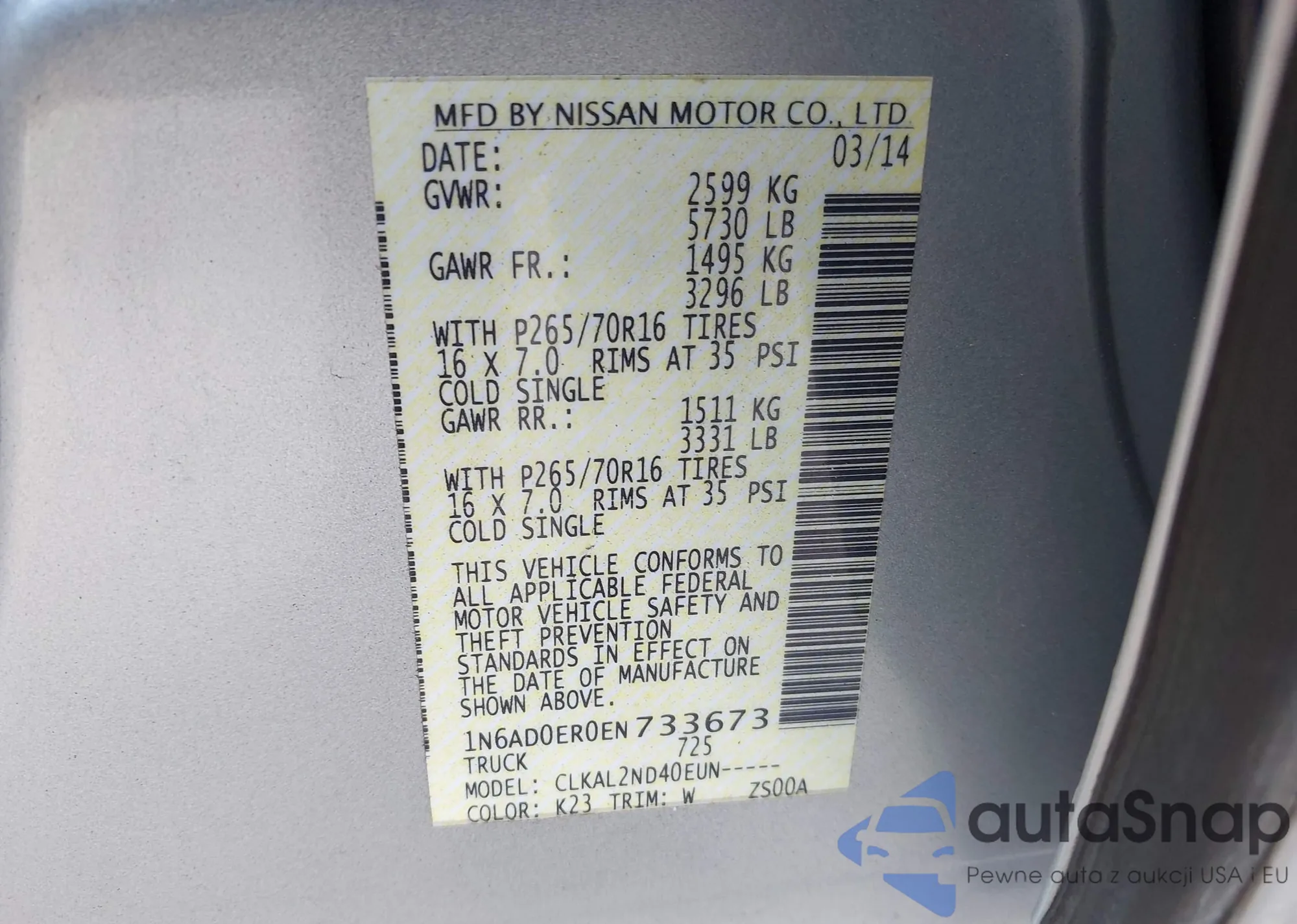 LOT: 43275290 VIN: 5N1BT3CB9PC815509