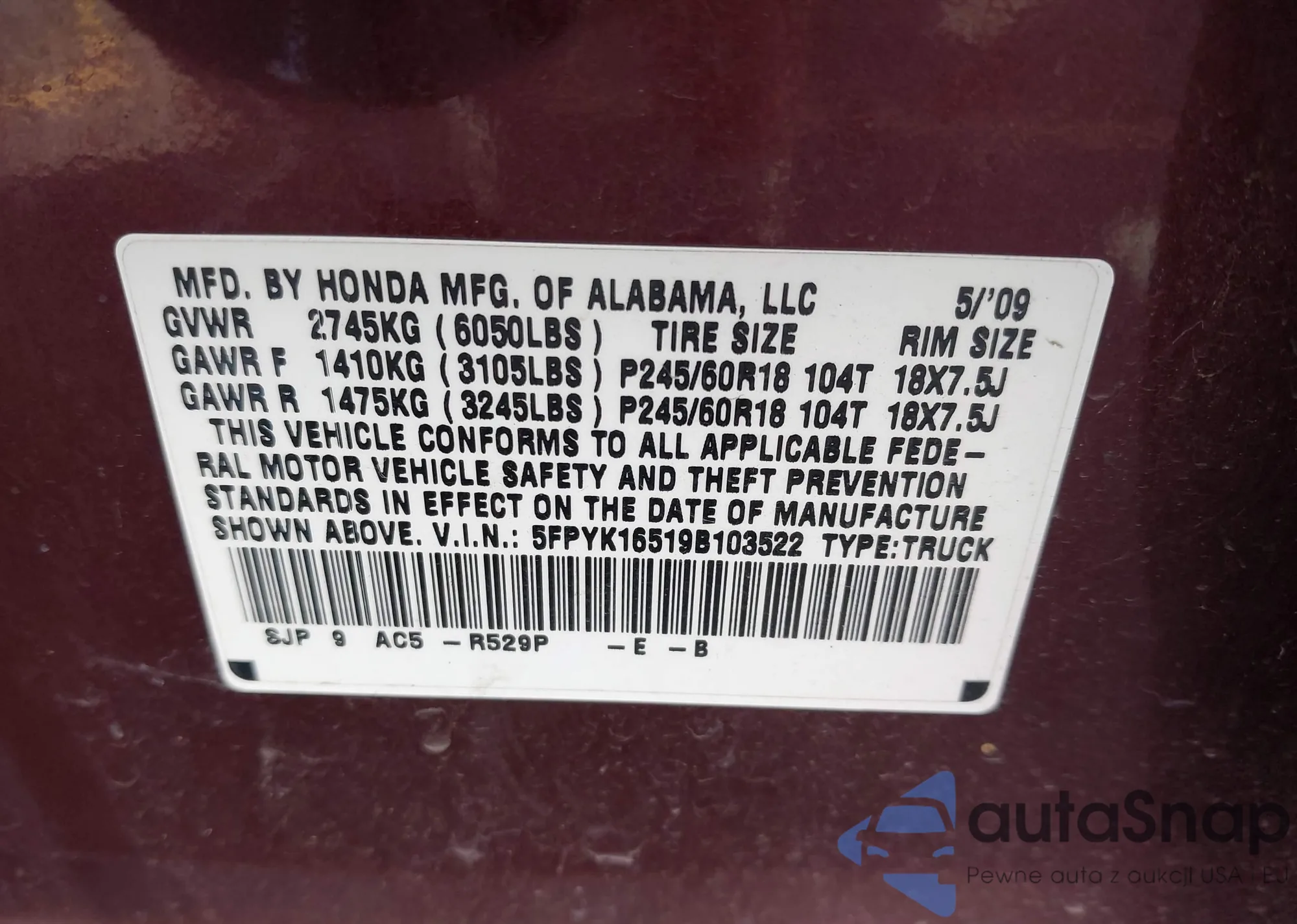• VIN 5FPYK16519B103522