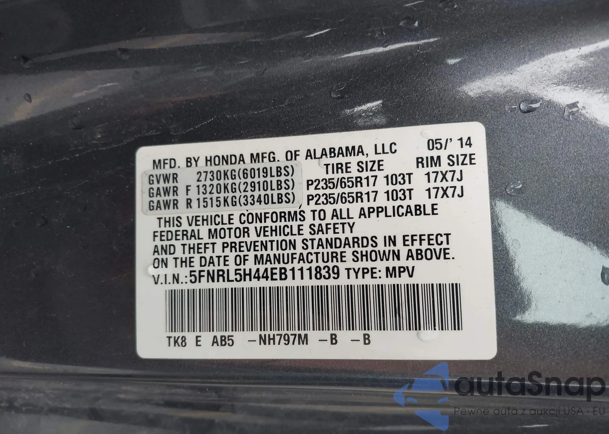• VIN 5FNRL5H44EB111839