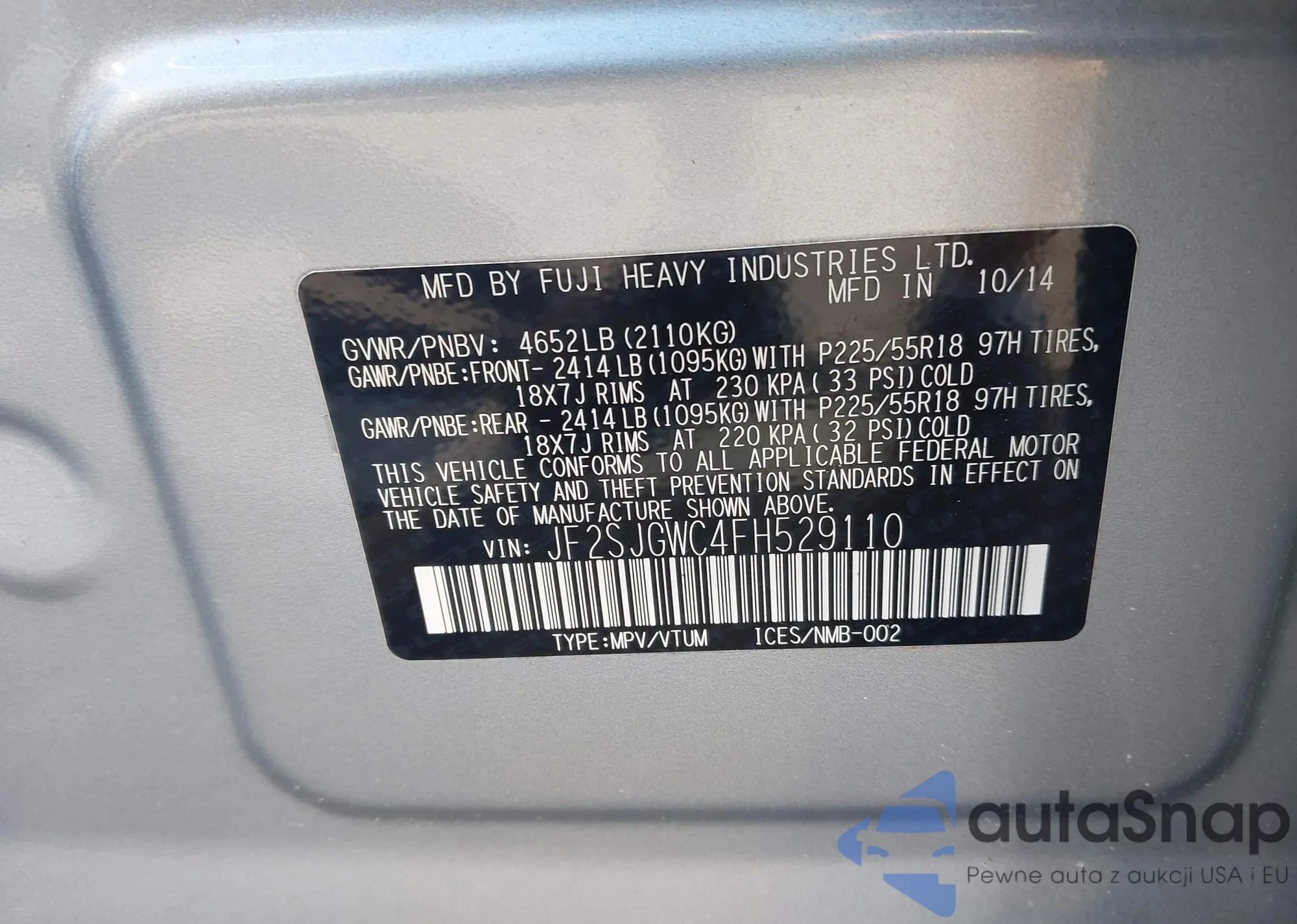 LOT: 43171109 VIN: JF2SJGWC4FH529110