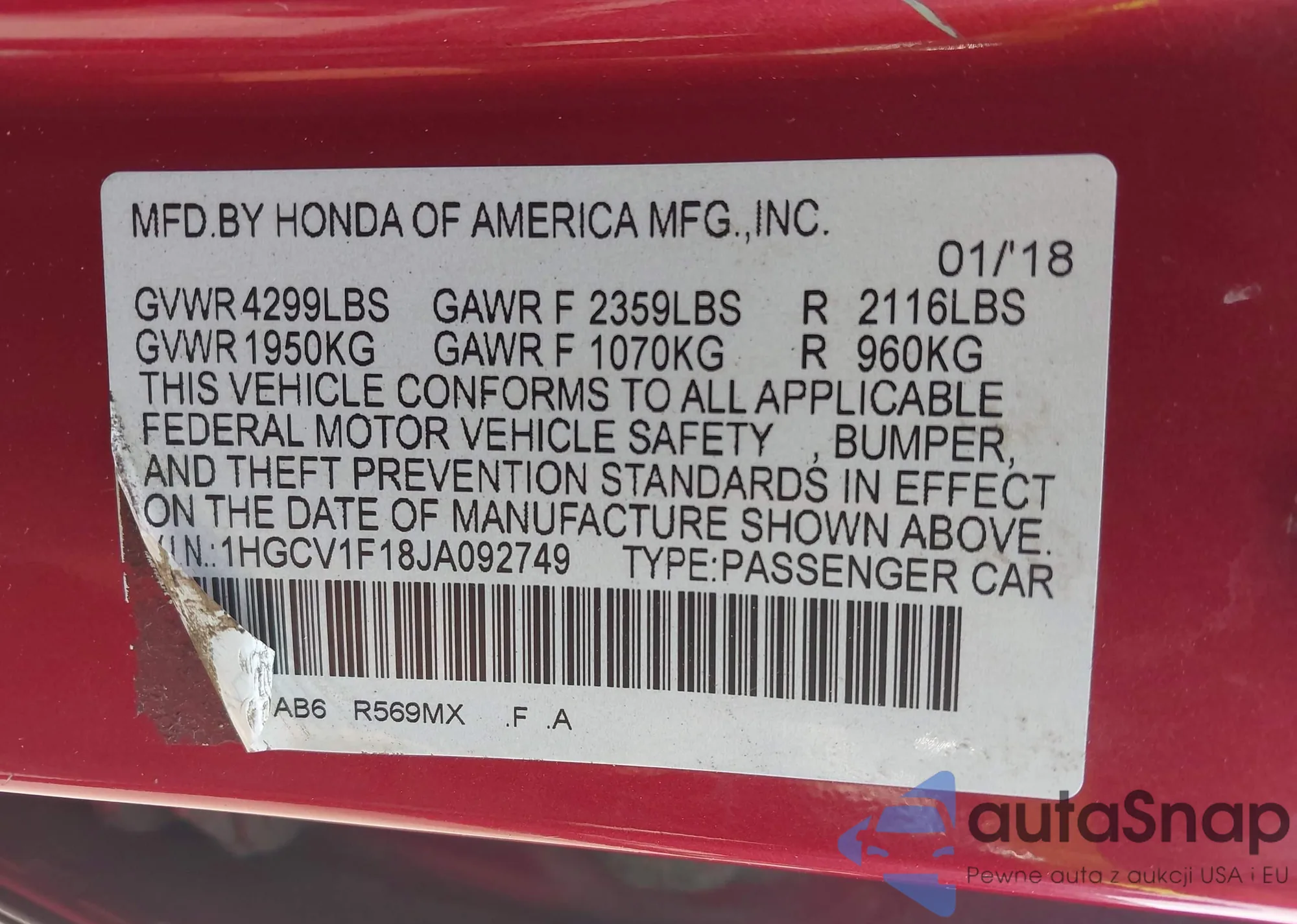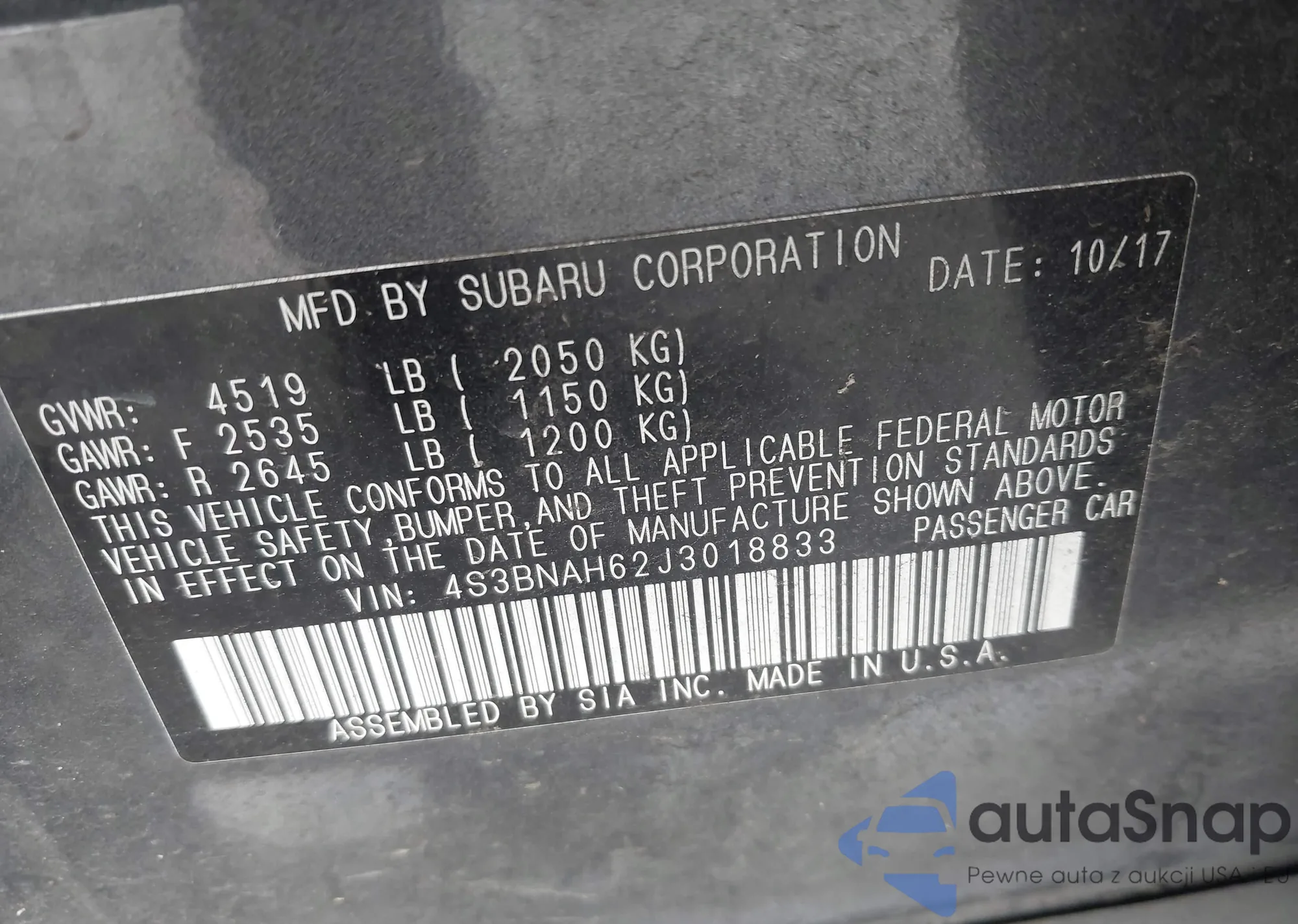 LOT: 42877812 VIN: 4S3BNAH62J3018833
