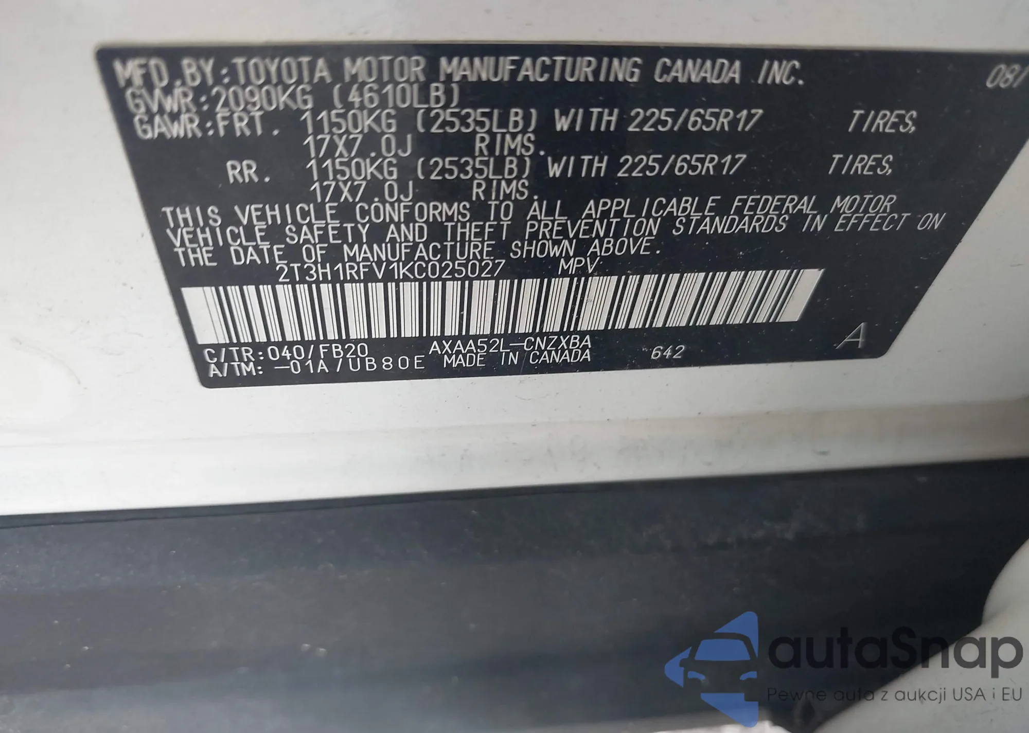 LOT: 43124021 VIN: 2T3H1RFV1KC025027