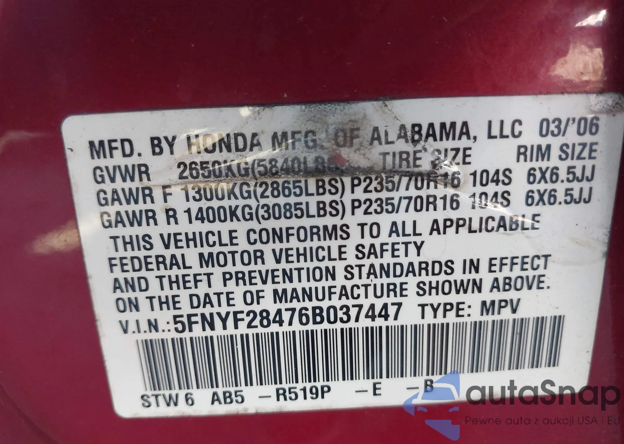 LOT: 43395591 VIN: 5FNYF28476B037447