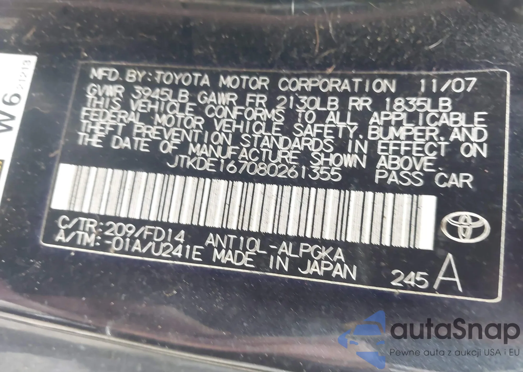 LOT: 42792598 VIN: JTKDE167080261355