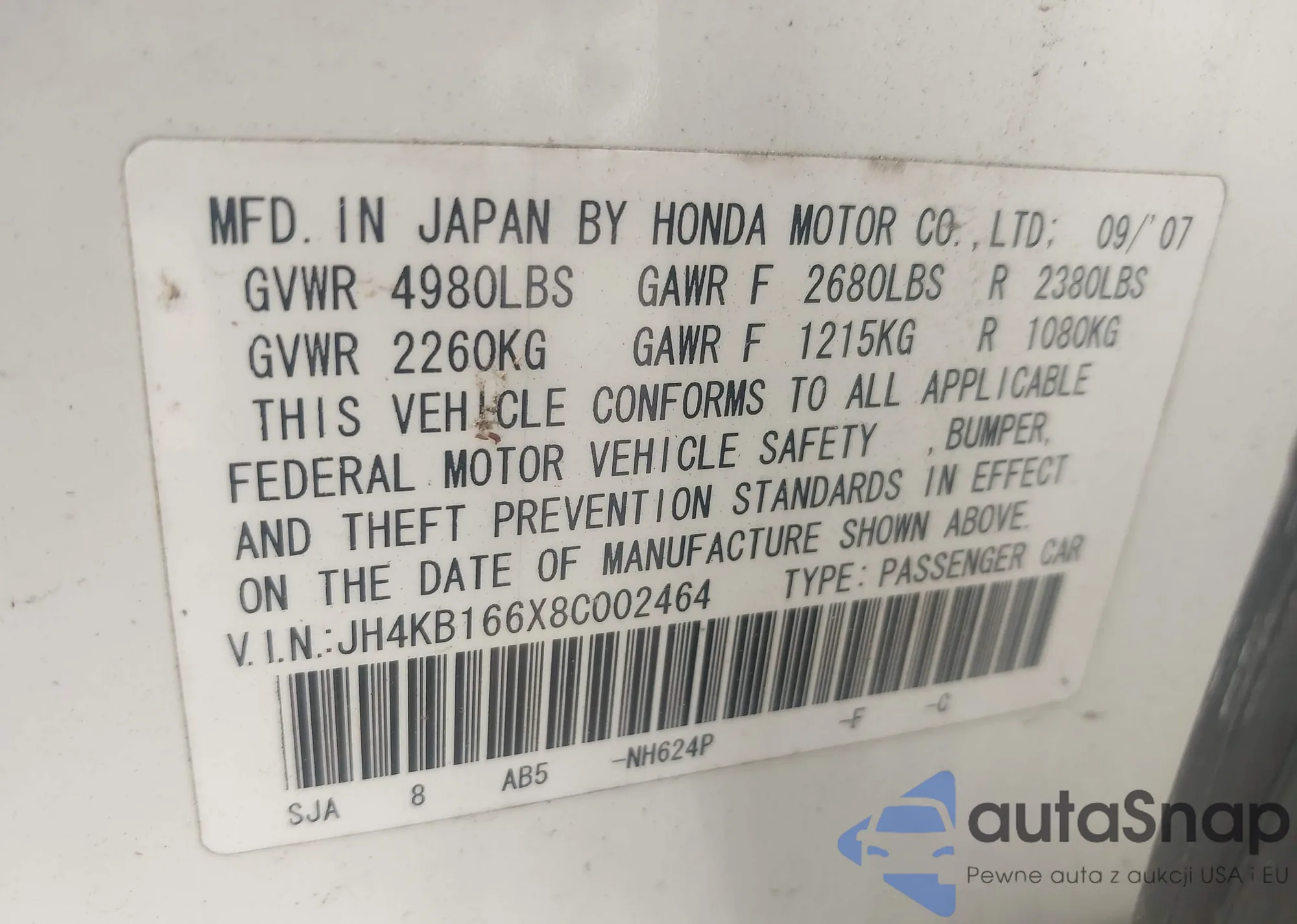 LOT: 43432480 VIN: JH4KB166X8C002464