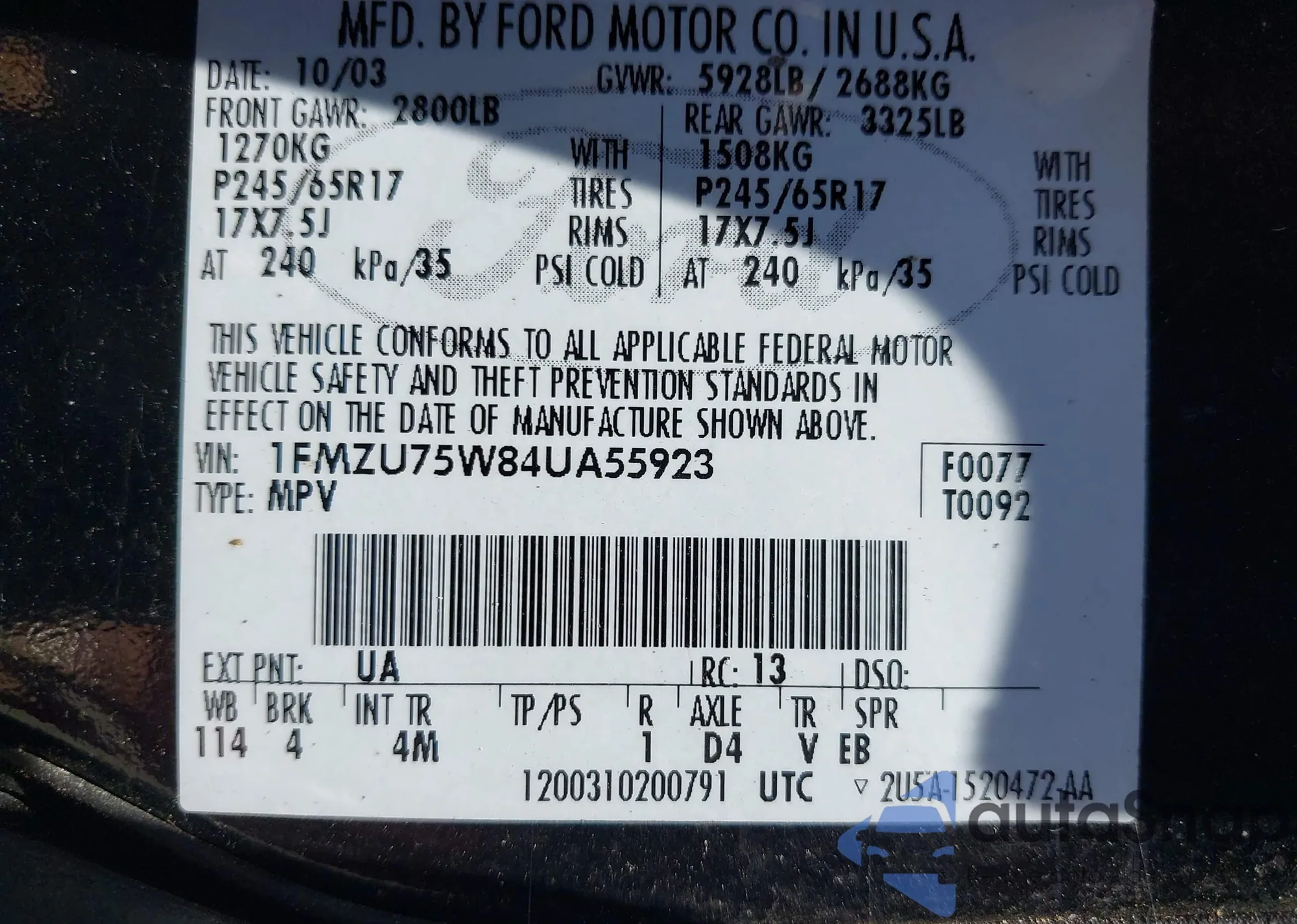 • VIN 1FMZU75W84UA55923