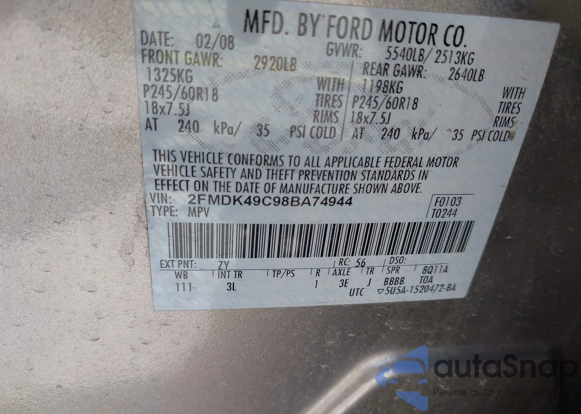 LOT: 43124067 VIN: 2FMDK49C98BA74944