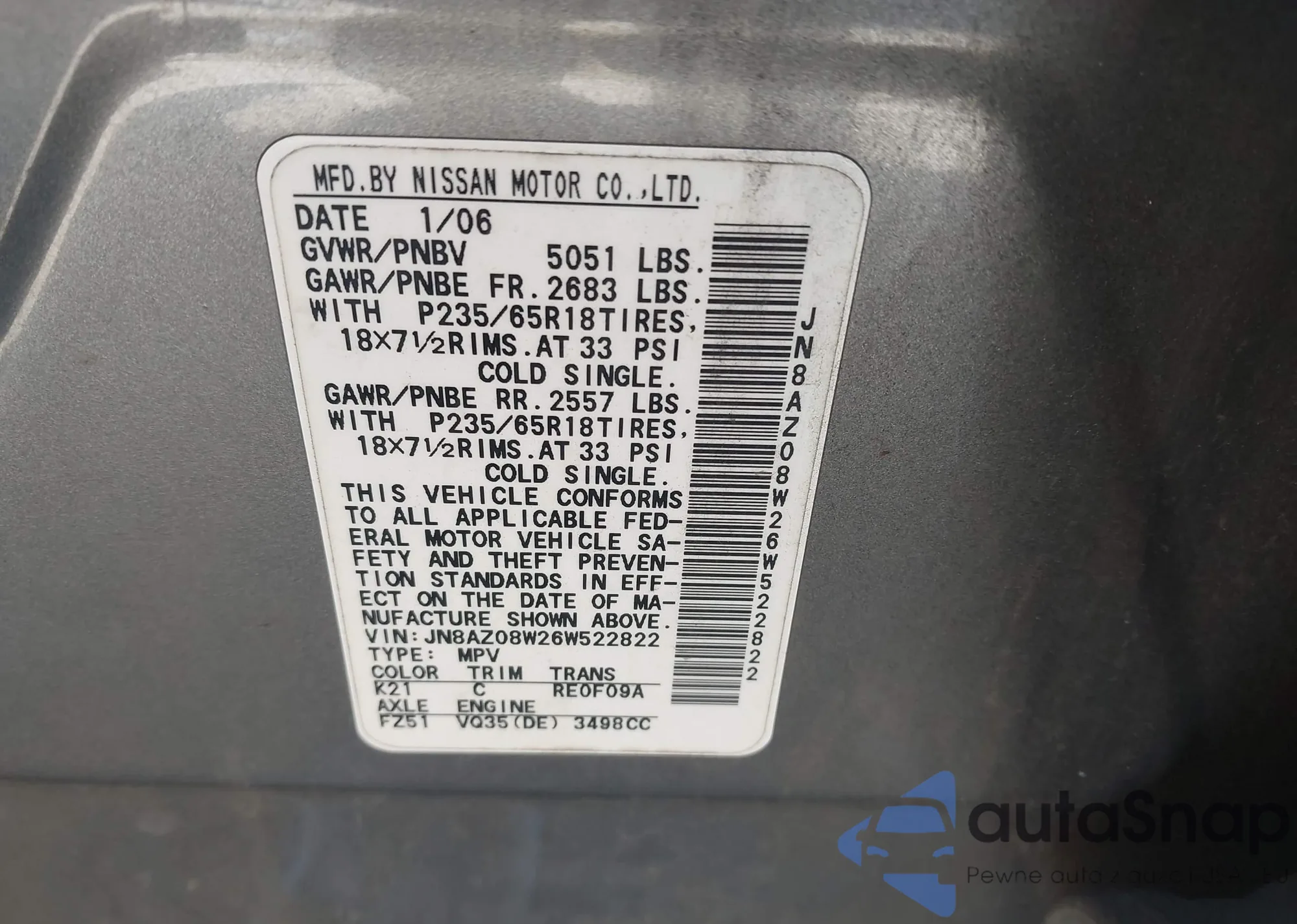 LOT: 43192084 VIN: JN8AZ08W26W522822