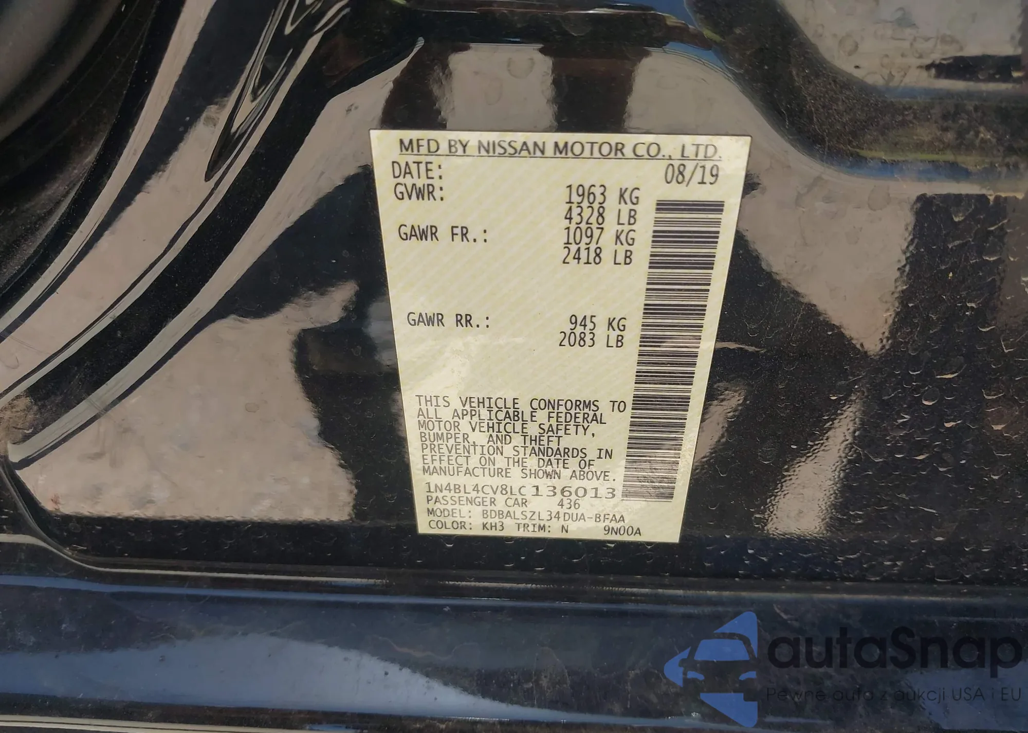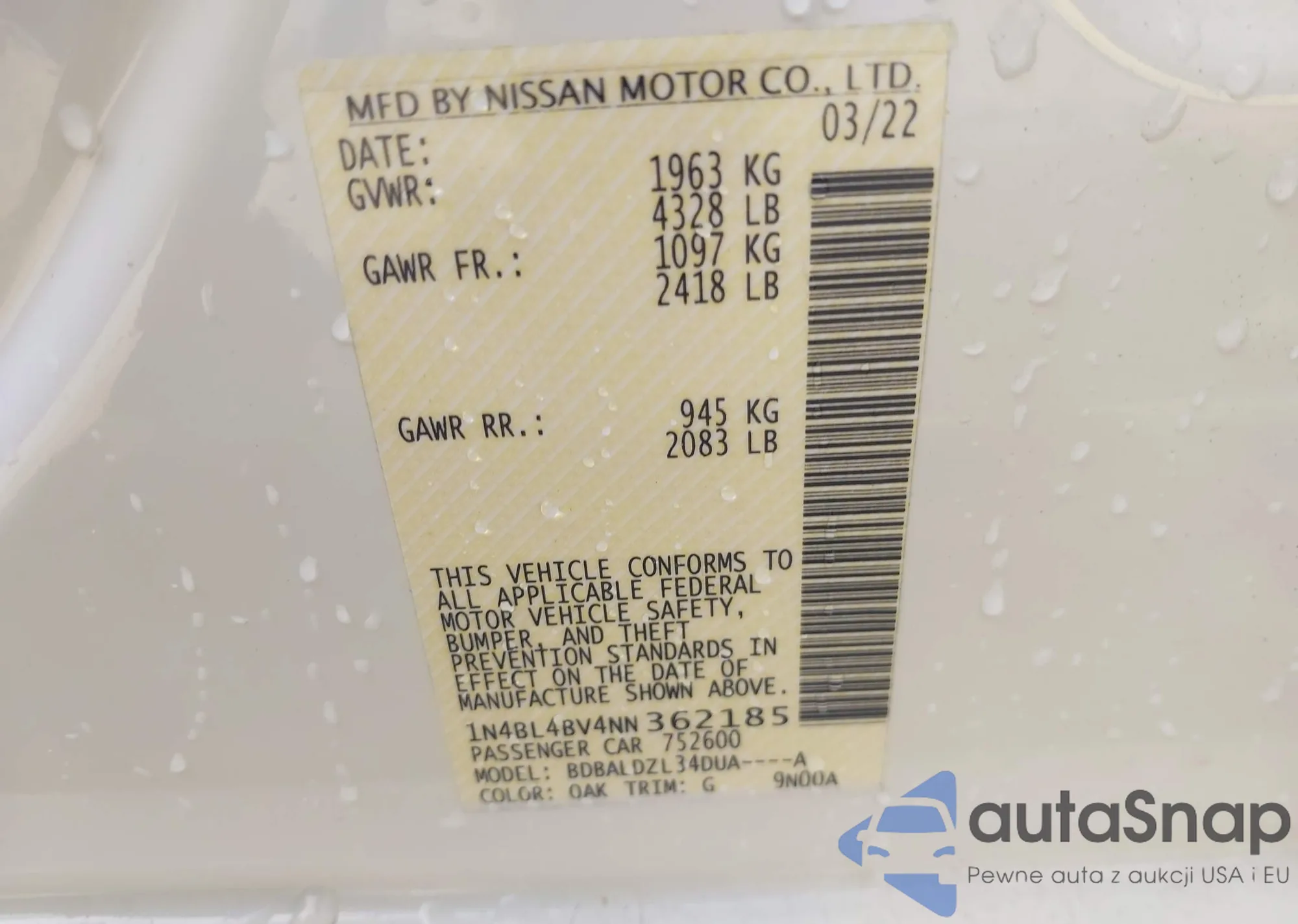 LOT: 42823837 VIN: 1N4BL4BV4NN362185