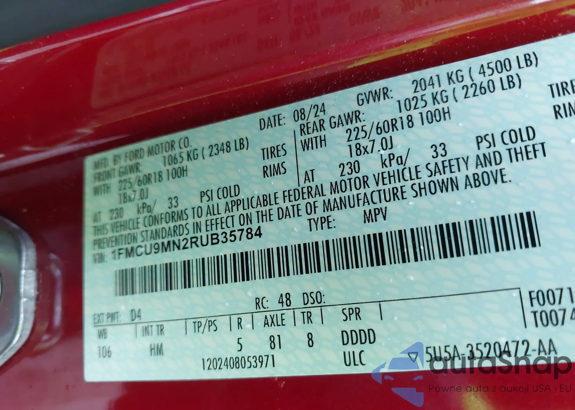 LOT: 43030490 VIN: 1FMCU9MN2RUB35784