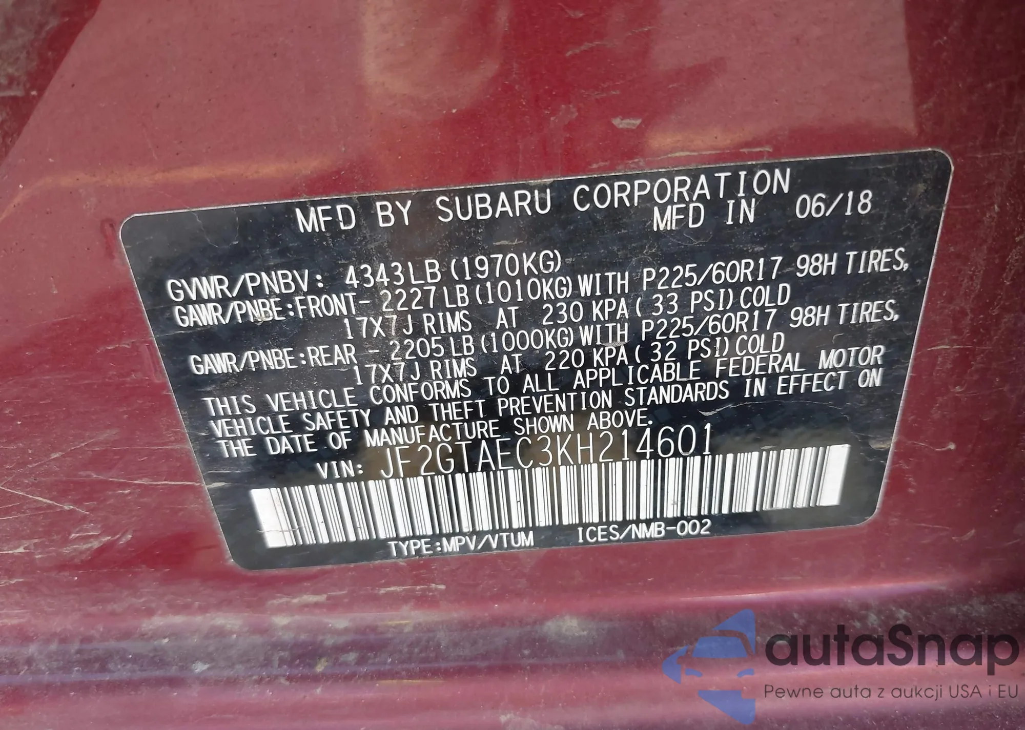 LOT: 43034533 VIN: JF2GTAEC3KH214601