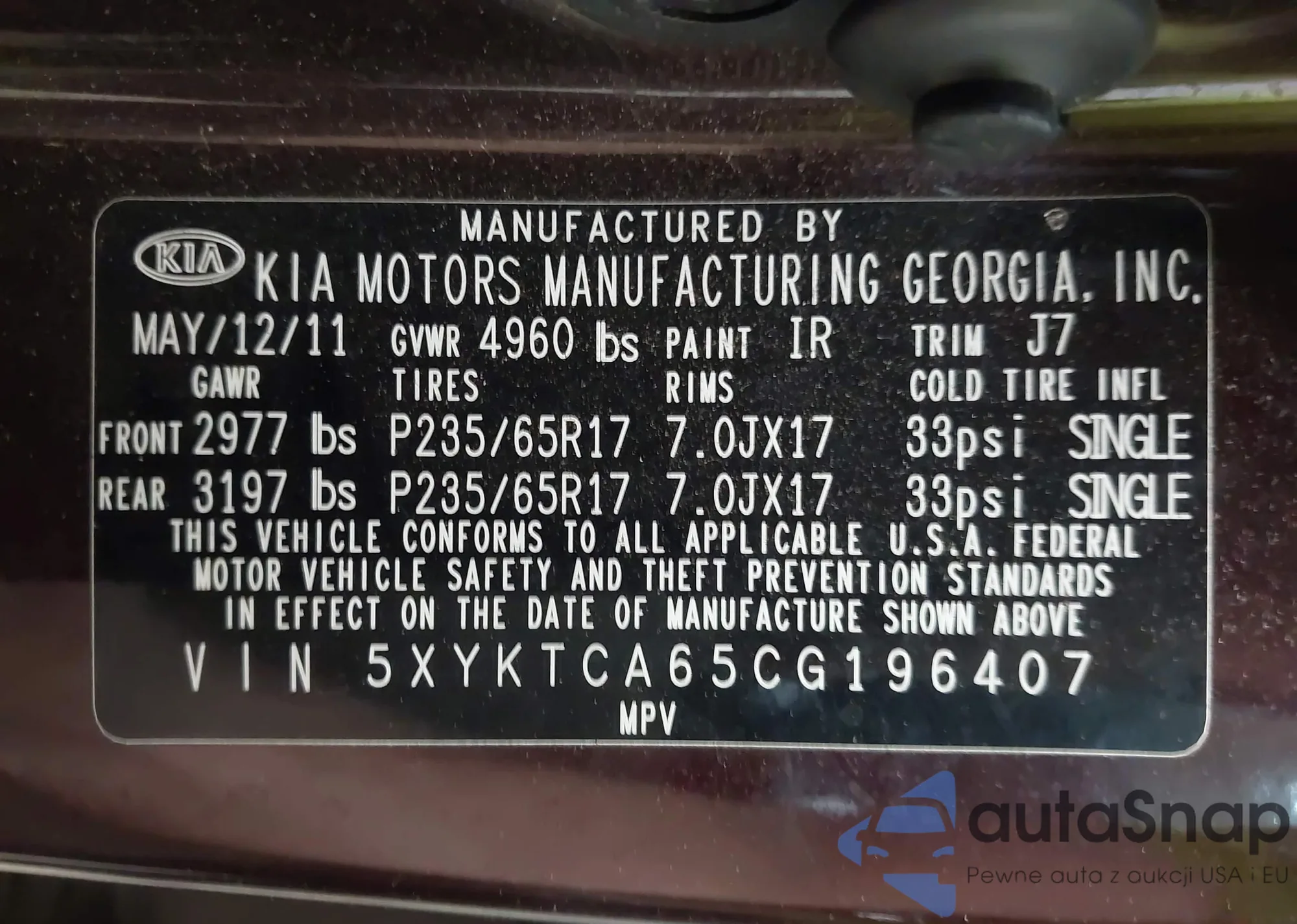 LOT: 43073226 VIN: 5XYKTCA65CG196407