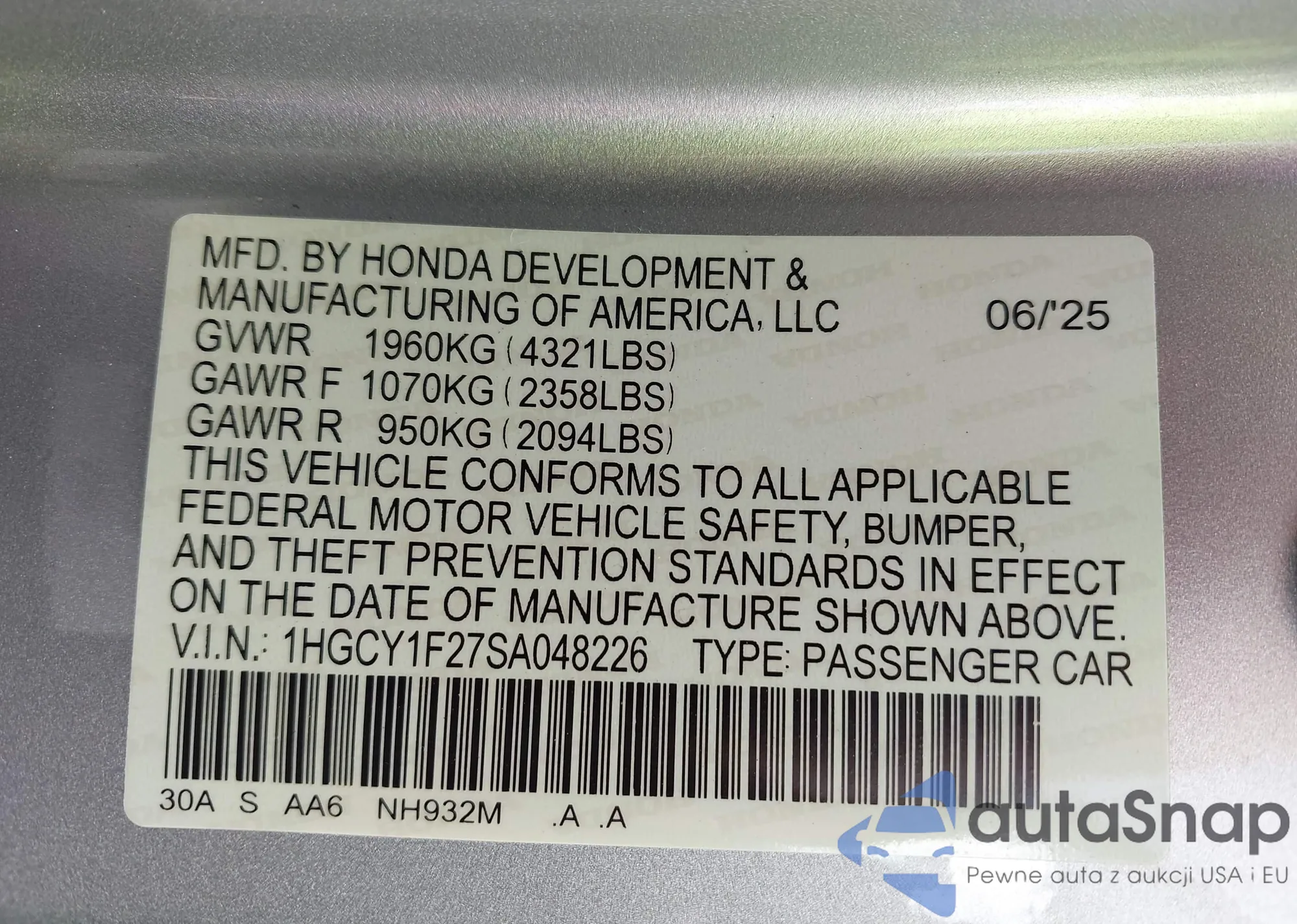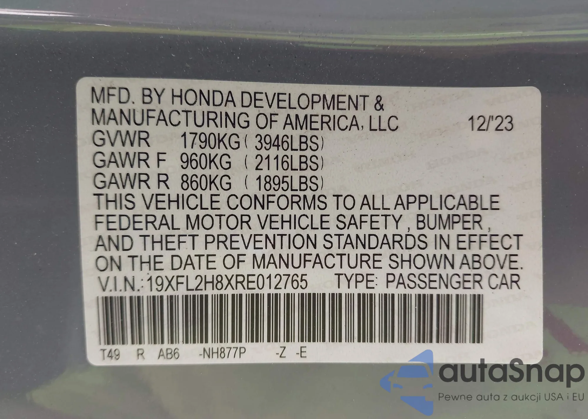 LOT: 43133650 VIN: 19XFL2H8XRE012765