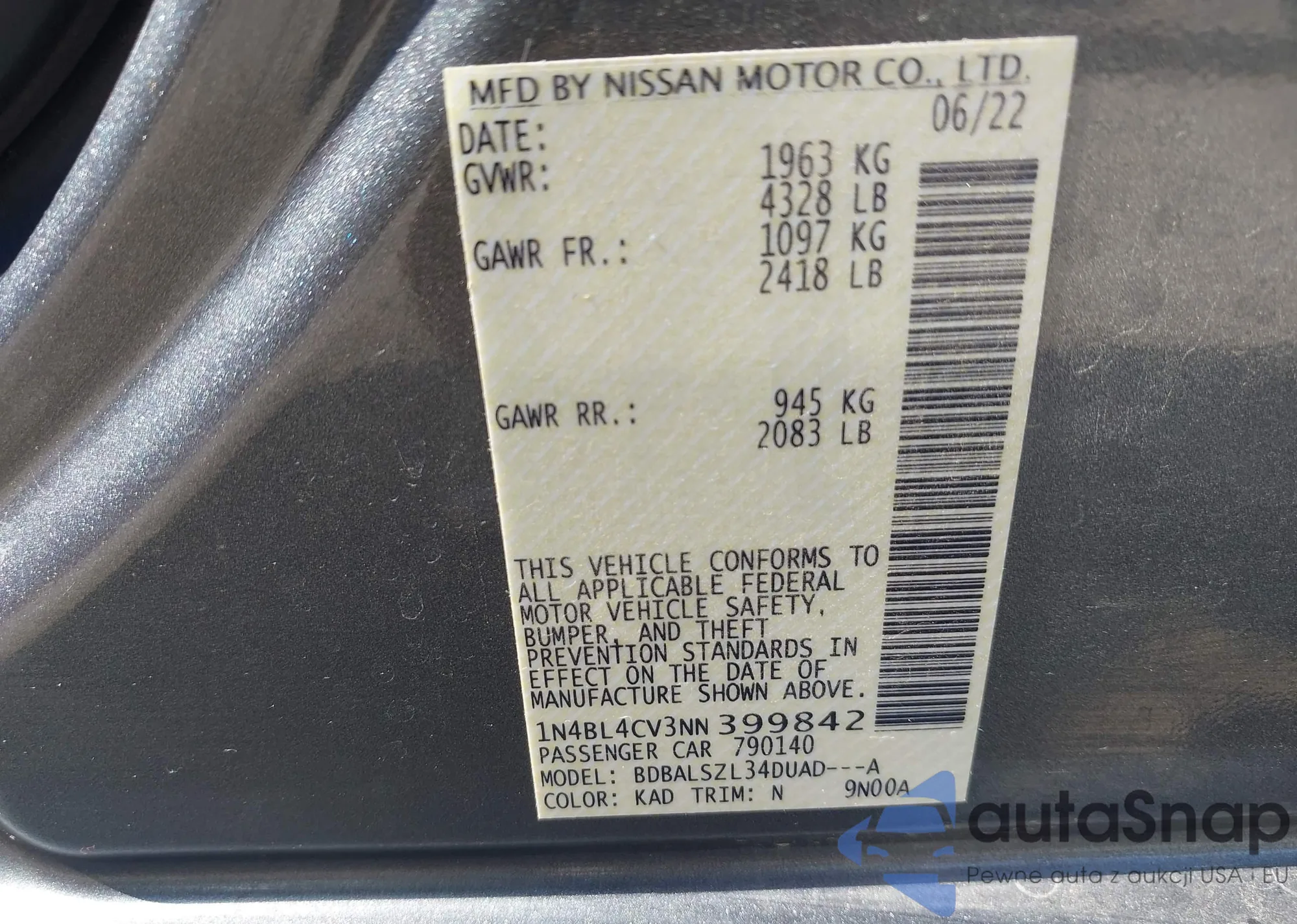 LOT: 43417649 VIN: 1N4BL4CV3NN399842